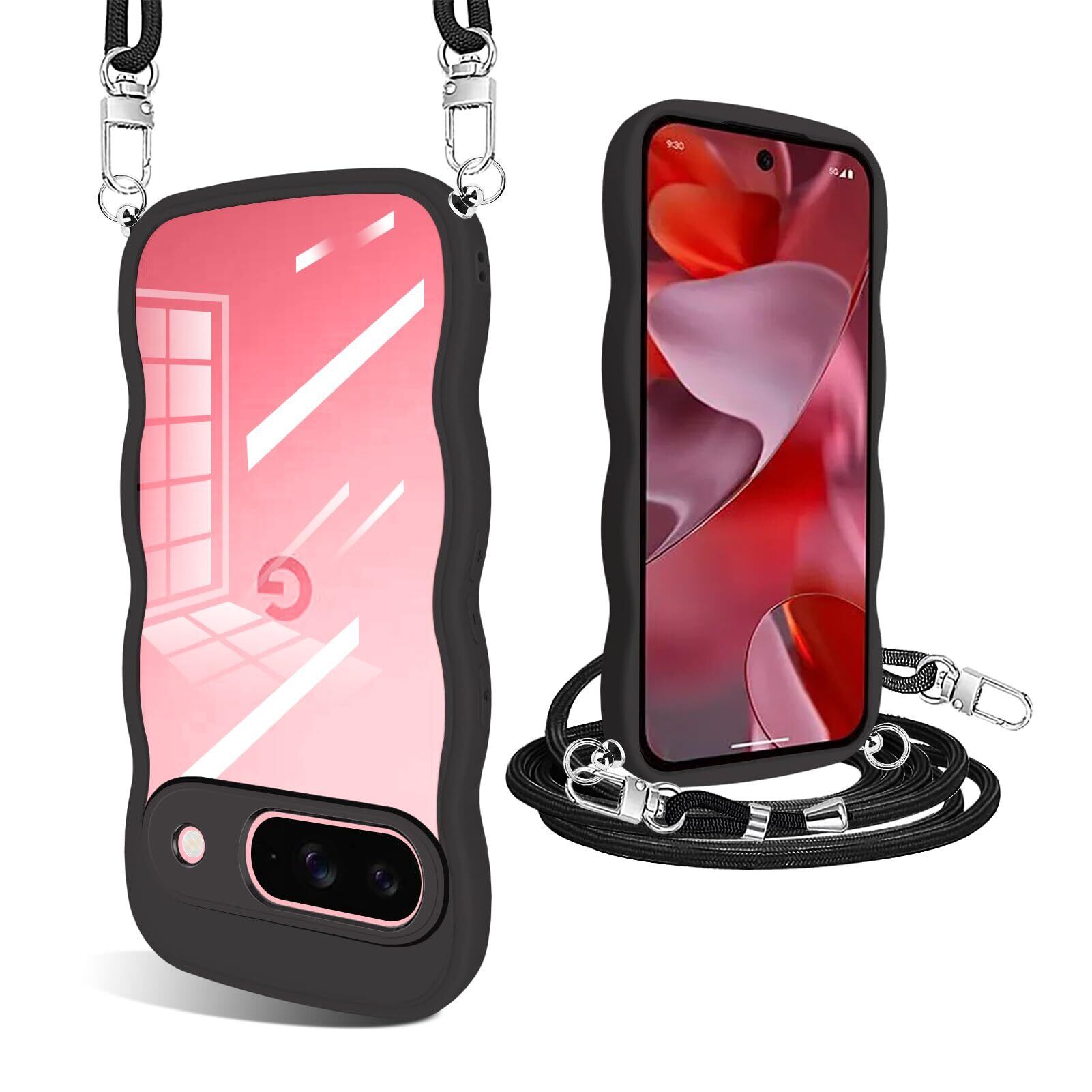 Pixel 9 ケース クリア ショルダー ストラップ付き かわいい 波状フレーム グーグル ピクセル 9 カバー 人気 全面保護 透明 スマホケース 首かけ 肩掛け TPU 薄型 軽量 取り外し可能 長さ調整可能 ワイヤレス充電対応(ブラック) | yankees