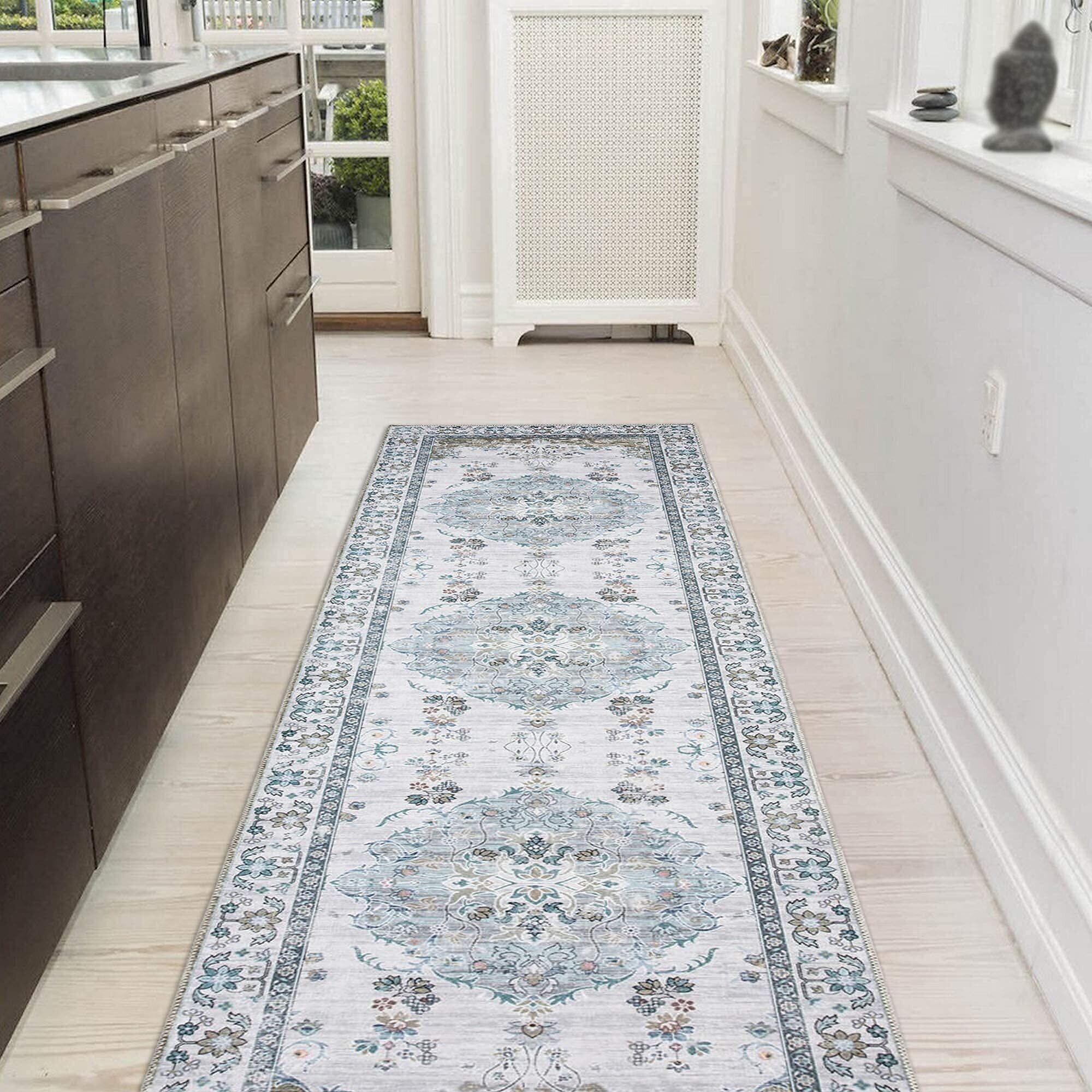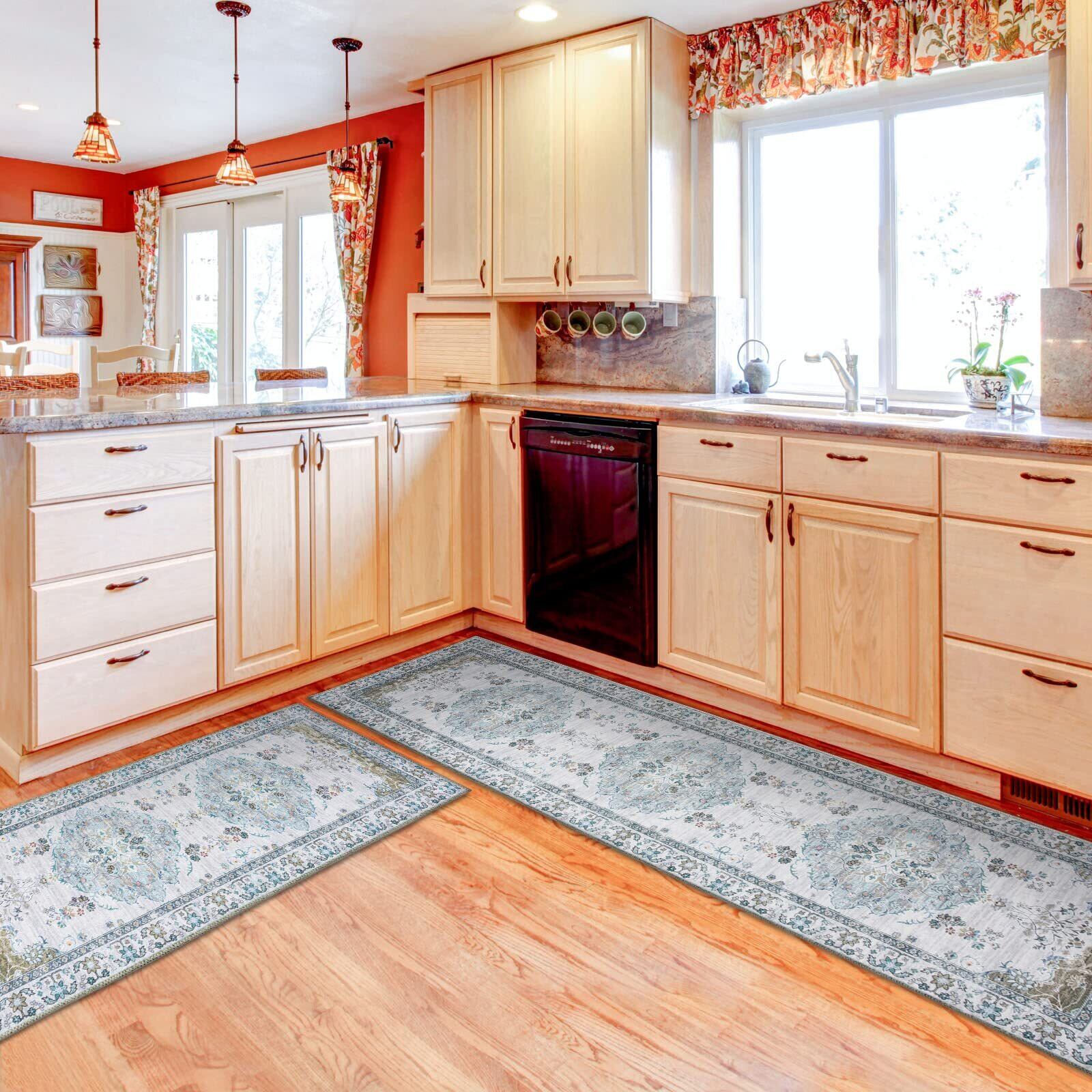 DECOMALL キッチンマット 120 洗える ペルシャ絨毯風 台所マット おしゃれ 45x120CM 廊下カーペット オールシーズン 軽量 滑り止め 花柄 した敷 防ダニ 防臭 床暖房対応 ラグ グレー