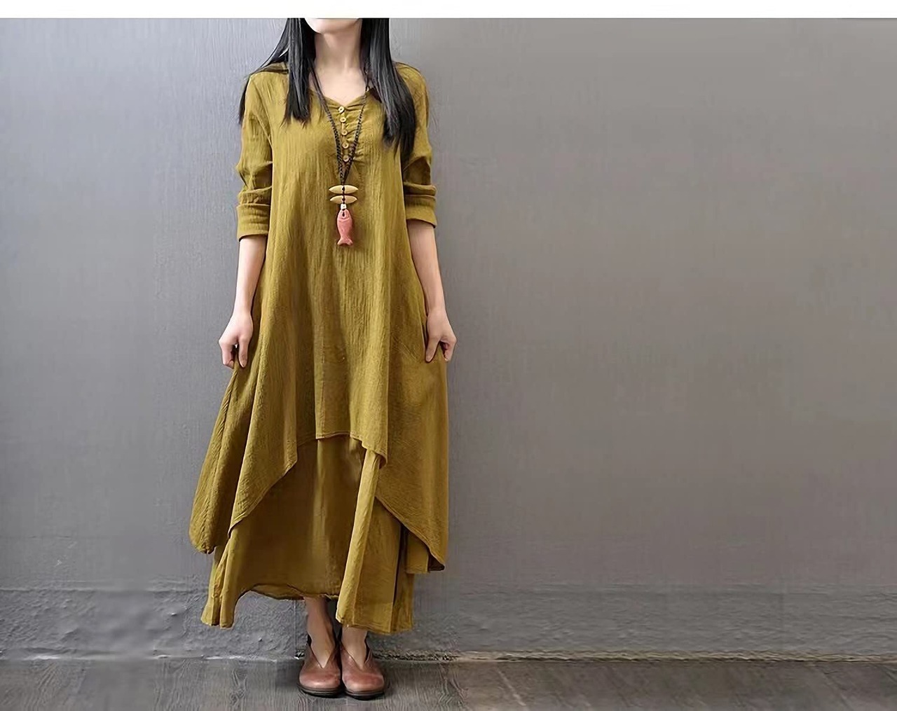 [JINJUDUO] レイヤードワンピース リネンワンピース レディース 春 夏 秋 ロングワンピース ふんわり 重ね着風 無地 Aライン ドレス マキシ丈 Vネック 体型カバー 着痩せ 大きいサイズ | yankees