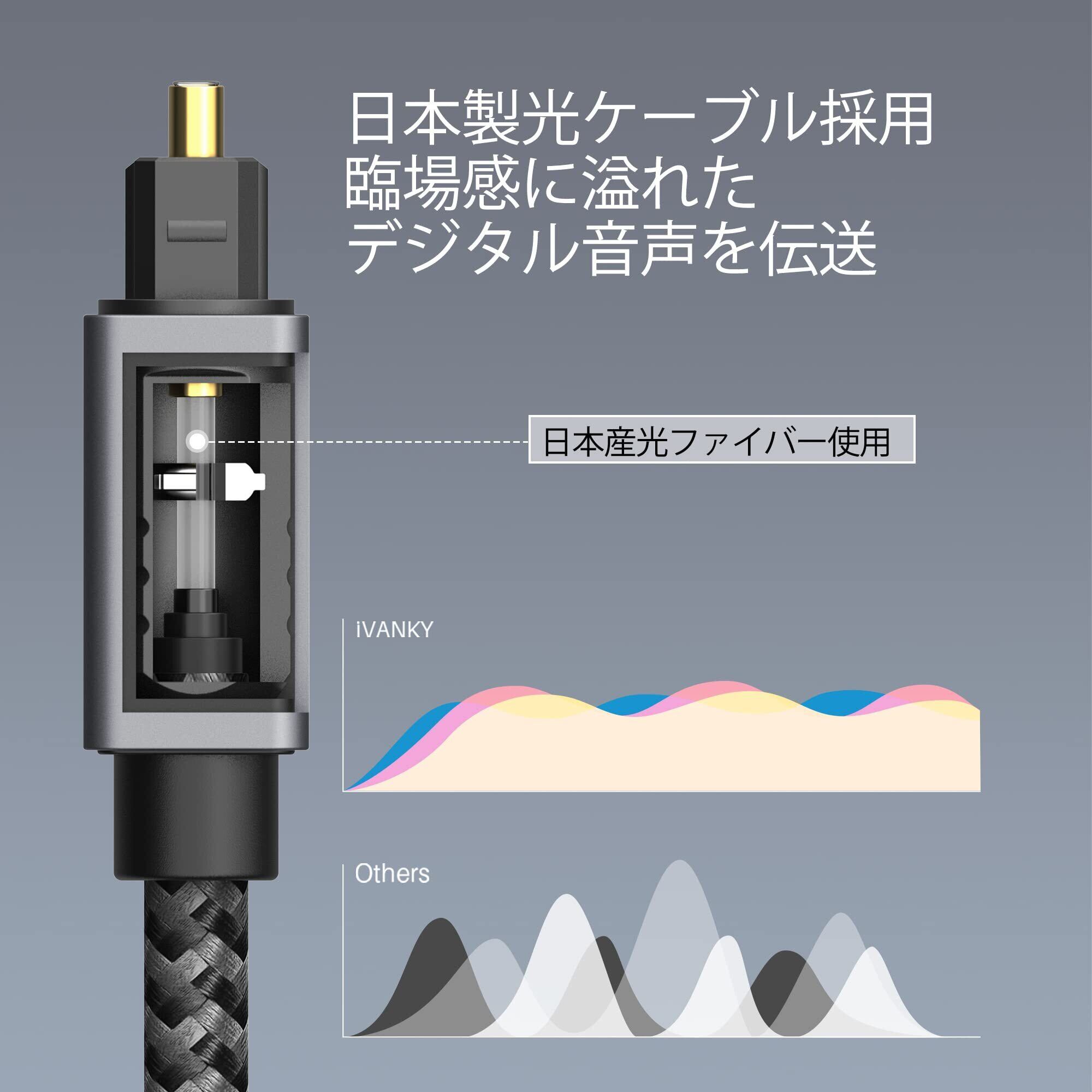 【日本産光ケーブル採用】よりよい音質を実現するために、iVANKY 光オーディオケーブル は日本産の切欠き加工光ファイバーを採用します。光ファイバー規定されたインピーダンス・信号減衰量・伝播遅延などの電気特性の値を全て満たし、歪みのなく臨場感に溢れたデジタル音声を伝送できます。
