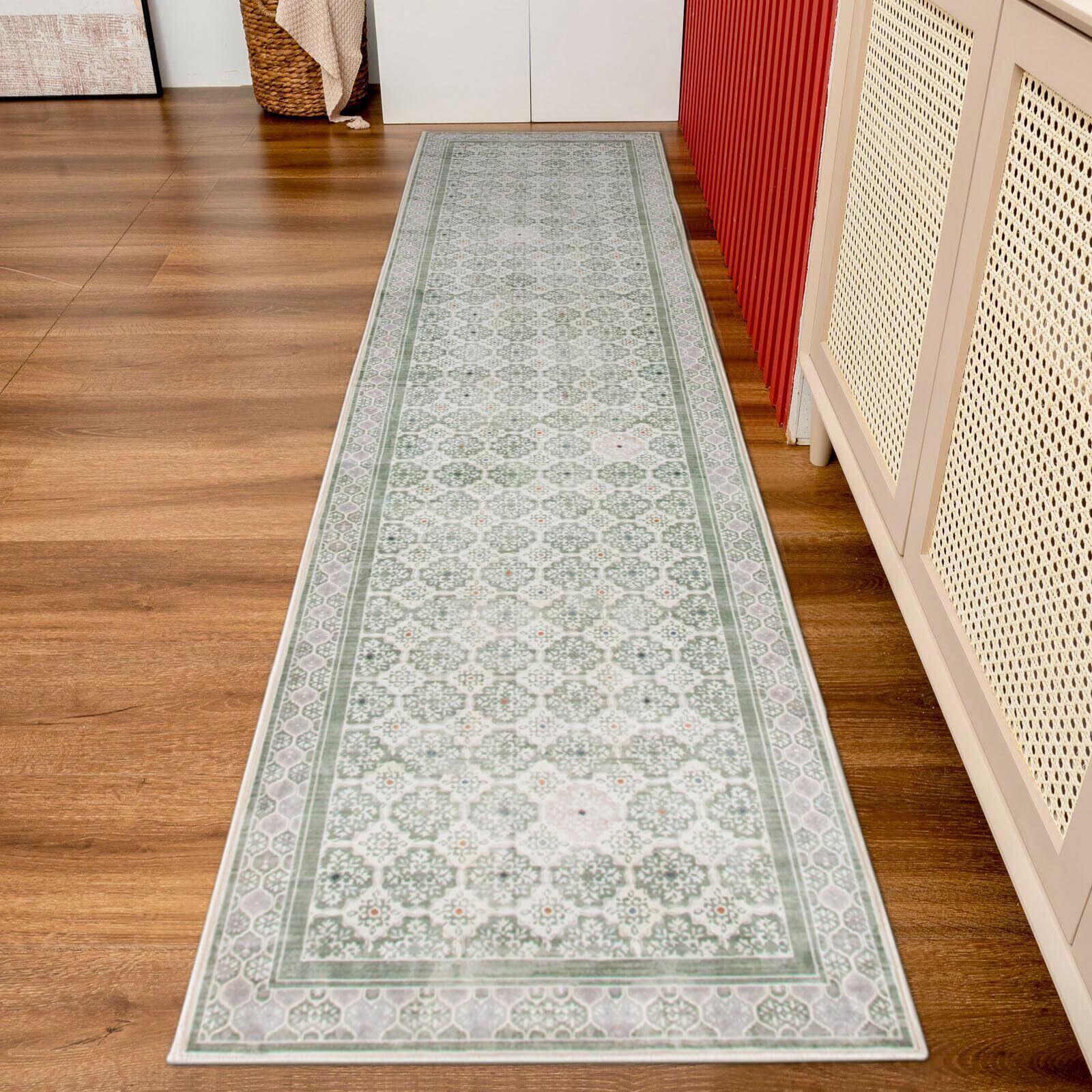 DECOMALL キッチンマット 240 洗える ペルシャ絨毯風 廊下マット カーペット 60x240CM 花柄 台所マット 滑り止め 防ダニ 防虫 防臭 グリーン 緑 床暖房対応