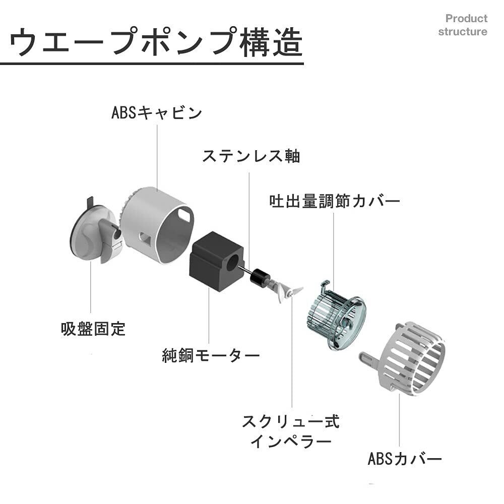 【規格】入力電圧:AC 100V 50/60Hz 電力:3W 最大流量:3000L/H 騒音クラス:35デシベル以下 電源コードの長さ:2.5M 適応水槽サイズ:50-80CM