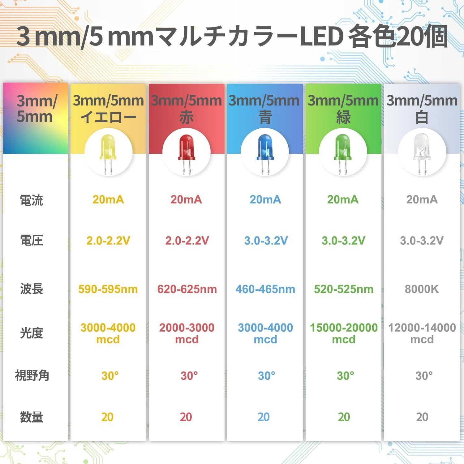 【製品詳細】 3mm発光ダイオード、5色、各色4個、合計20個。