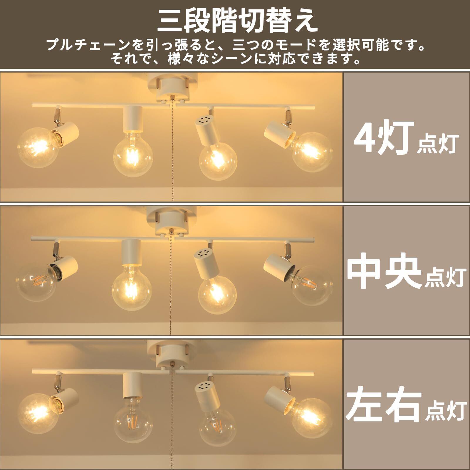 【プルスイッチ付き&点灯モード切り替え】壁スイッチのないお部屋にも利用可能です。プルスイッチを引っ張るだけ、4灯⇒内側2灯⇒外側2灯⇒消灯の順番で切り替わります。