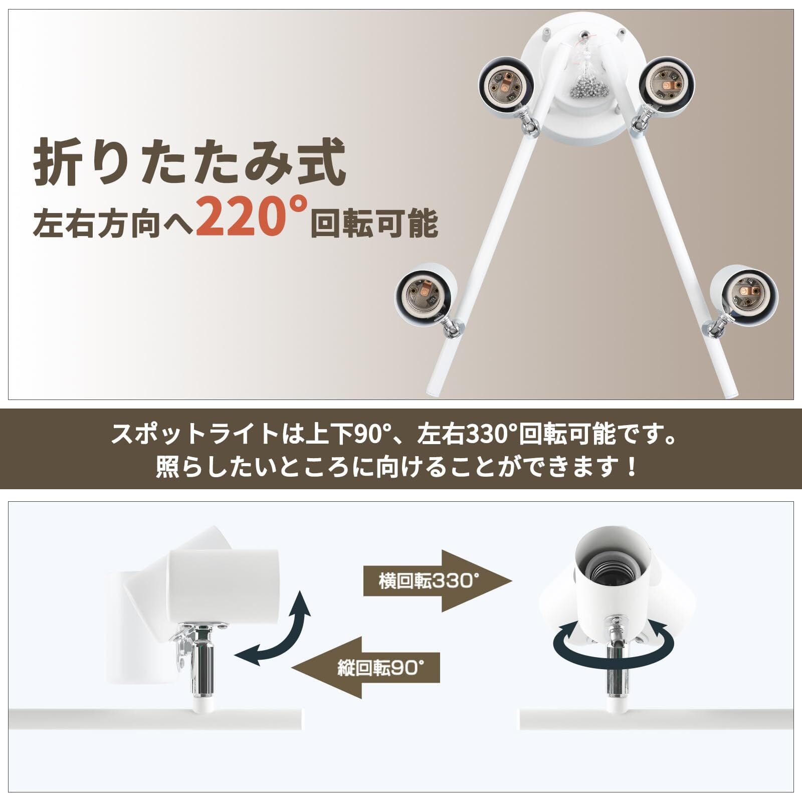 【角度調整&折り畳み可能】スポットライトは折りたたみ式ですので、支柱は220°水平回転可能です。4灯はすべて90°角度調整、330°回転可能なので、照らしたい角度に向けることができます。