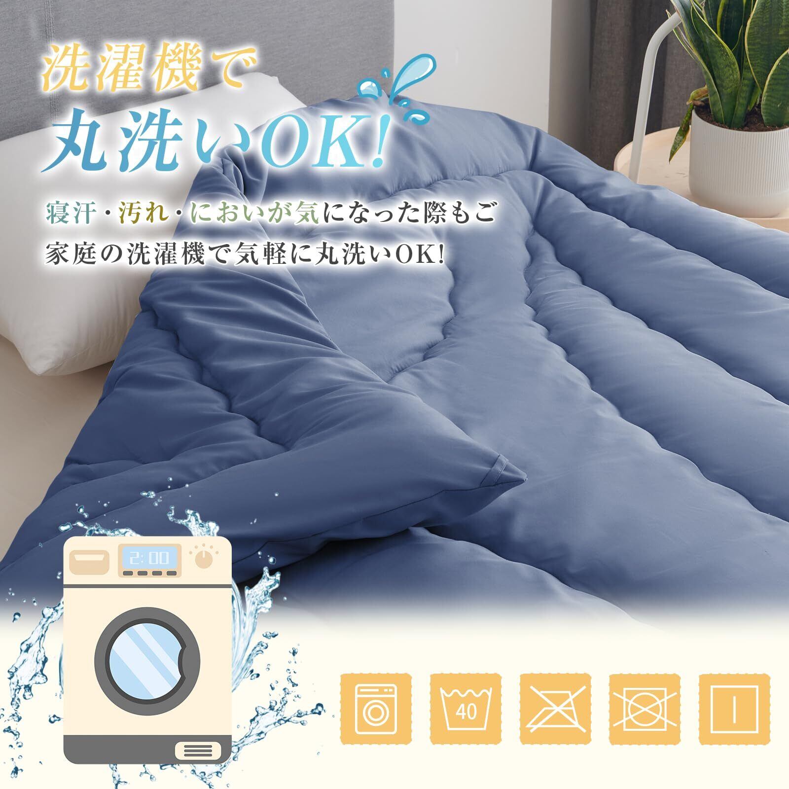 ①商品サイズ:幅約150cm×奥行約210cm(シングルサイズ)②商品重量:約1.5kg③材質/表地:ポリエステル100% (ピーチスキン加工)、詰め物(重量:1.0kg)、上層部:ポリエステル100%、下層部:ポリエステル100%④カバー取り付け紐数:8カ所 ⑤お手入れ方法:洗濯機で簡単に洗えるため、手間いらずで清潔を保つことができます。特別な手入れが不要で、日常的な使用に最適です。