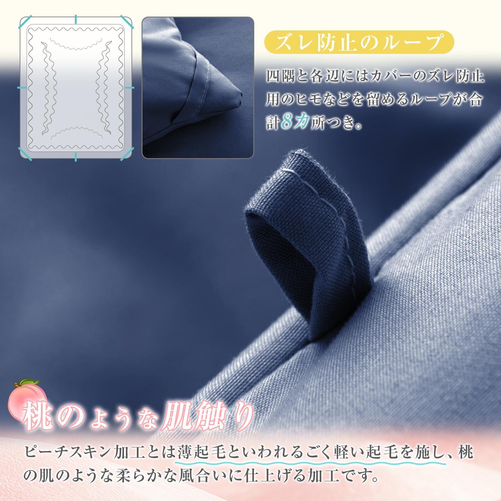 【ピーチスキン加工、やわらかくしっとり触感】肌に優しいピーチスキンの触り心地でしっとり気持ちよく、ムレにくく快適です。ほこりが出にくい、綿切れしにくい、中空ポリエステル綿を使用。ズレ防止ループ付き端の8ヶ所にズレ防止用ループが付いているので、お布団がズレる心配もありません。