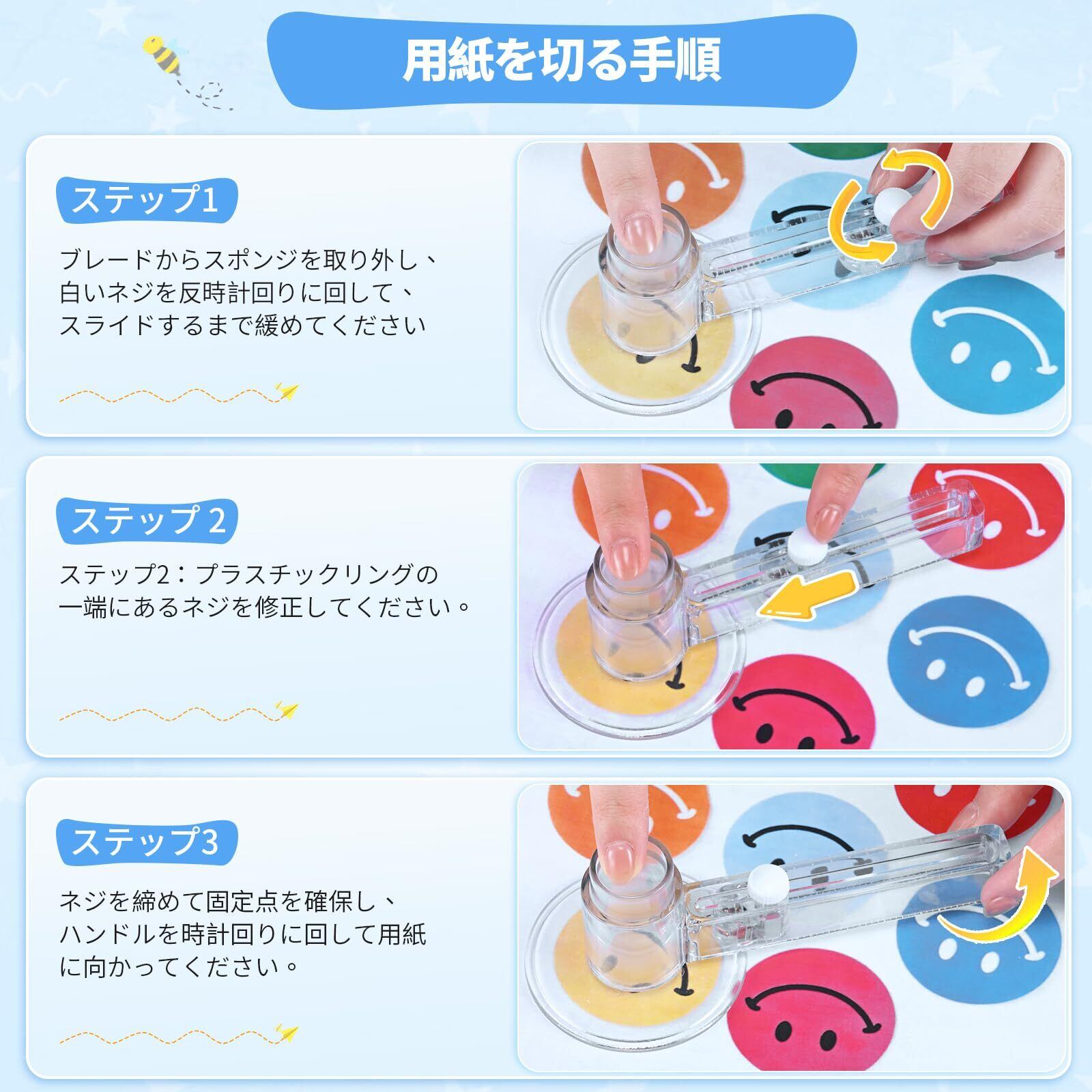 【3種類のサイズの交換可能な金型】:25mm、32mm、58mmの3つのサイズの交換可能な金型がセットになっており、自分の好みに合わせて自由にバッジを作ることができます。