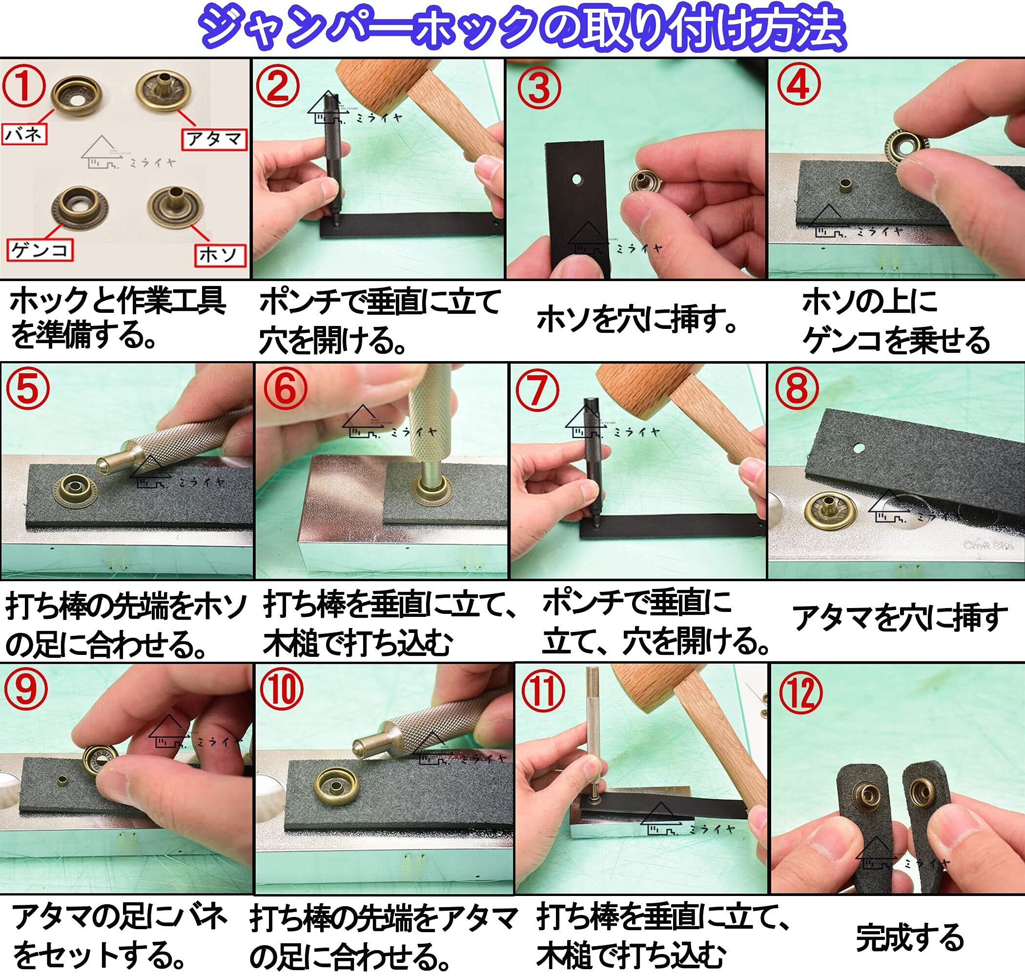 【セット内容:】:【ホック合計60組】:①バネホック10mm×12組 ②バネホック12mm×12組 ③バネホック15mm×12組 ④ジャンパーホック17mm×12組 ⑤ジーンズボタン17mm×12組。【打ち具合計9点】:655#10mm用*2本 。633#12mm用*2本。831#15mm用*2本。201#17mm用*1本 。ハトメ抜き : 2.5mm*1本。打ち台*1個(こちらの商品には説明書は付いております。ご了承のほどお願い申し上げます。)