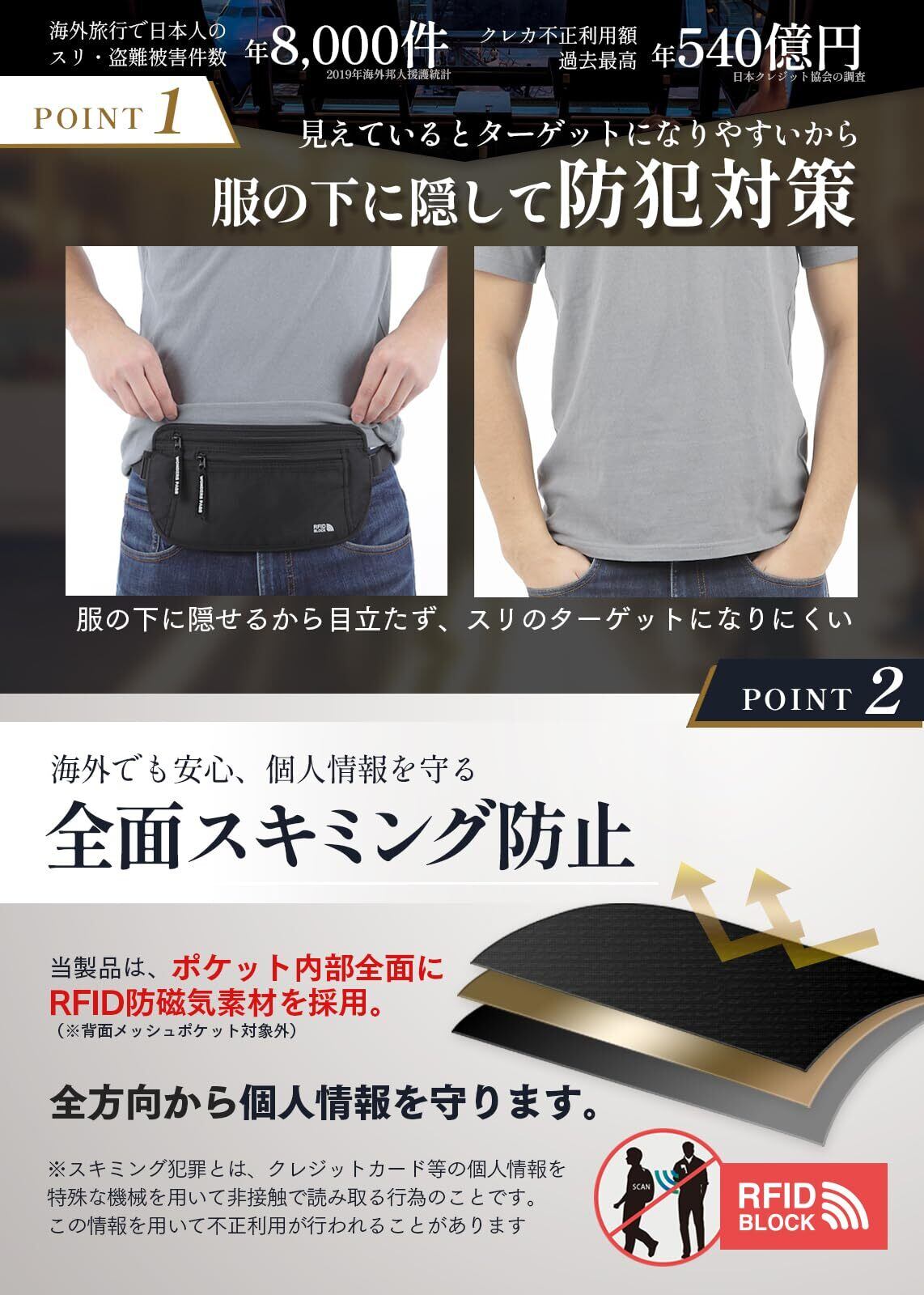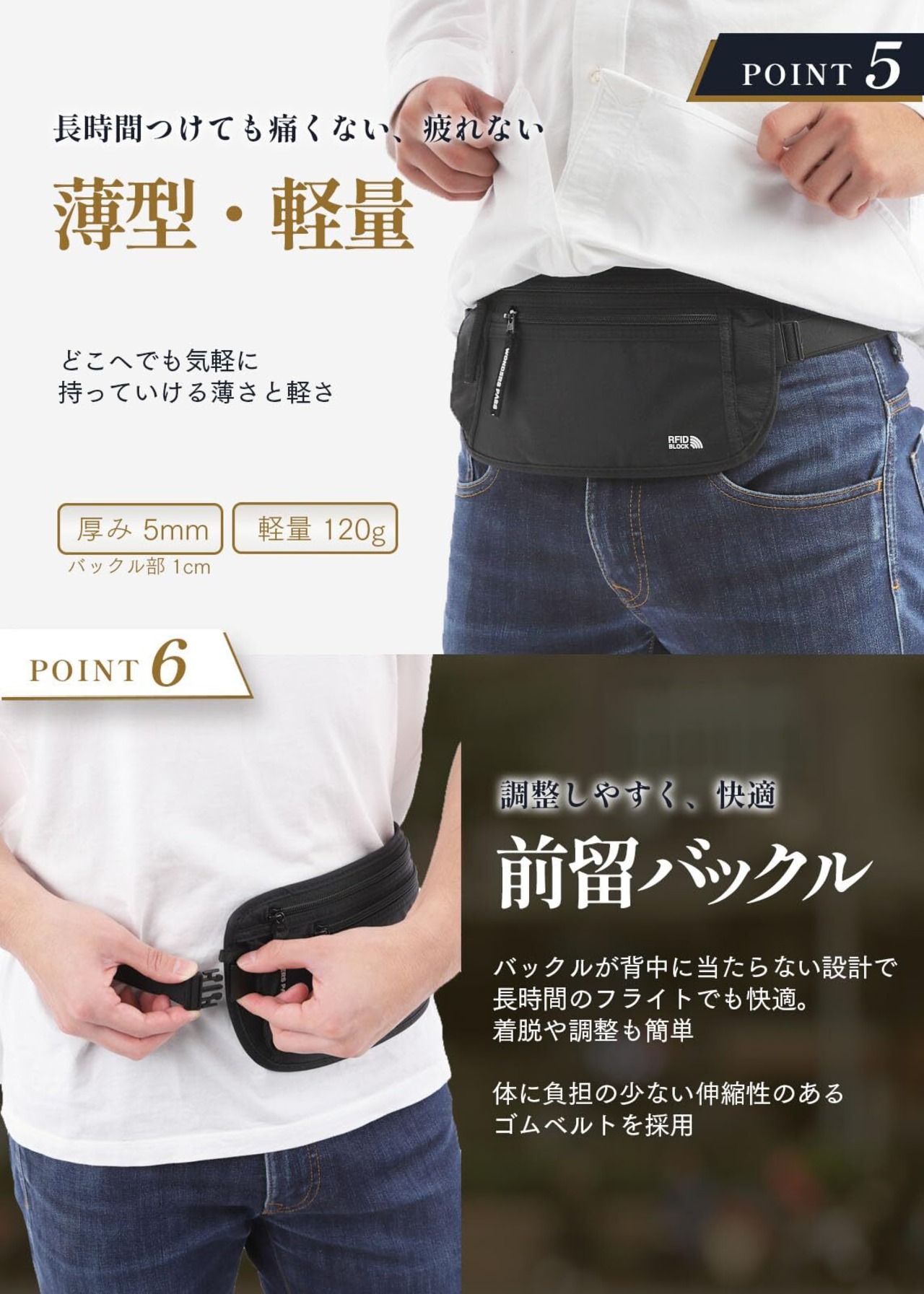 【全方向スキミング防止】ポケット前後にスキミング防止に役立つRFIDブロッキング生地を採用。個人情報を電子犯罪から守ります。 ポーチ中央厚5mm(バックル留め具部のみ1cm程度)と類似商品の中でもダントツの薄型なので、服の下にも目立たずに着用することが可能です。