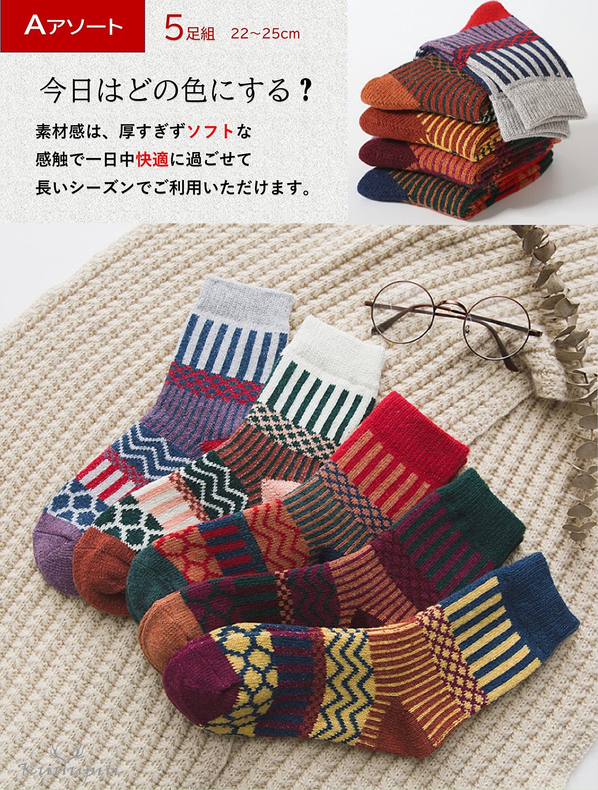 [kuuupiii] レディース ソックス 靴下 冬 厚手 暖かい あったか 防寒 登山 おしゃれ かわいい クルーソックス 柄物 ソフト口ゴム ボーダー カラフル 秋冬春 5足組 22-25cm