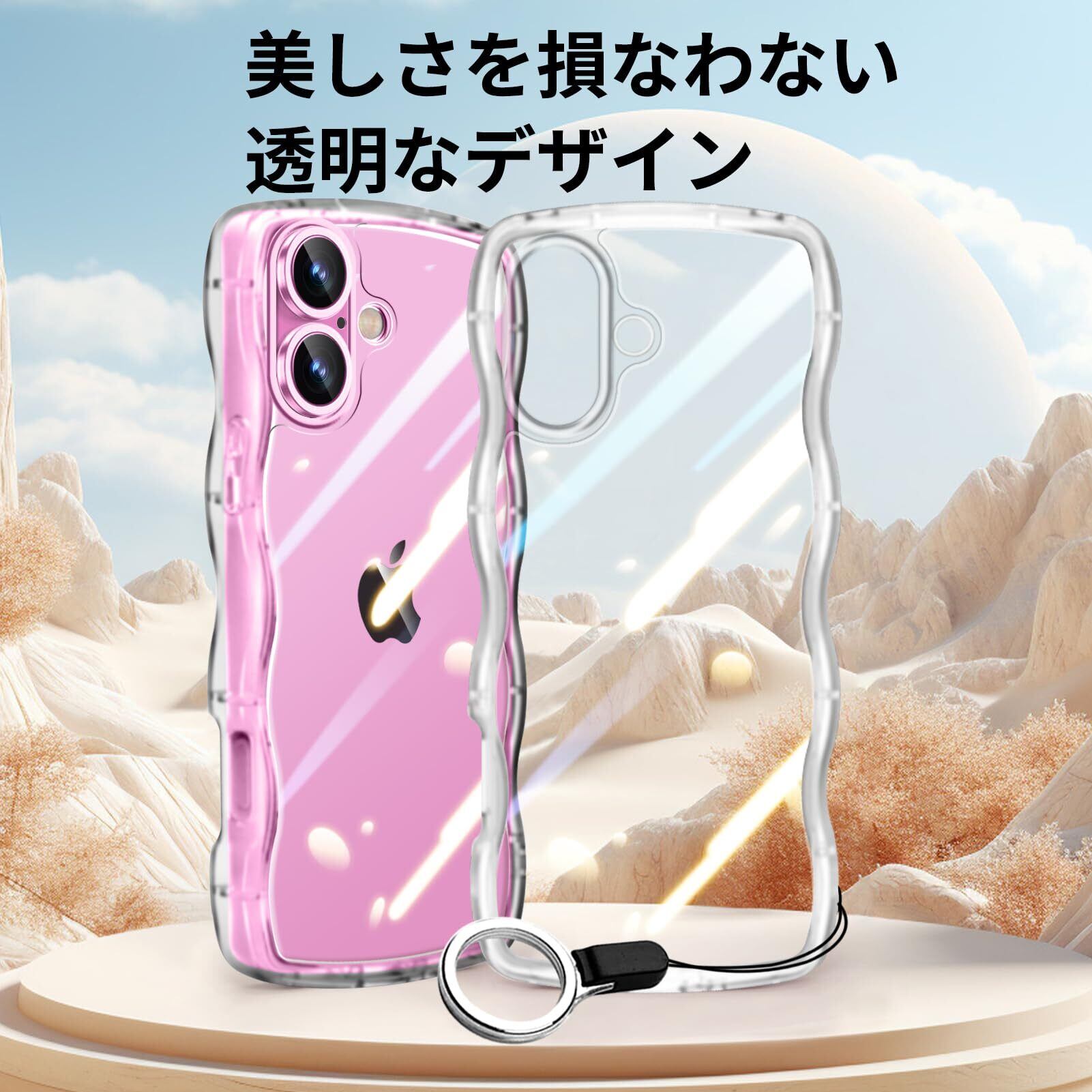 iPhone 16 用 ケース クリア 波状フレーム 耐衝撃 アイフォン 16 用 スマホケース かわいい 人気 可愛い 女性用 カバー 滑り止め ワイヤレス充電対応 ストラップホール付き ストラップ1種付き (クリア 透明)