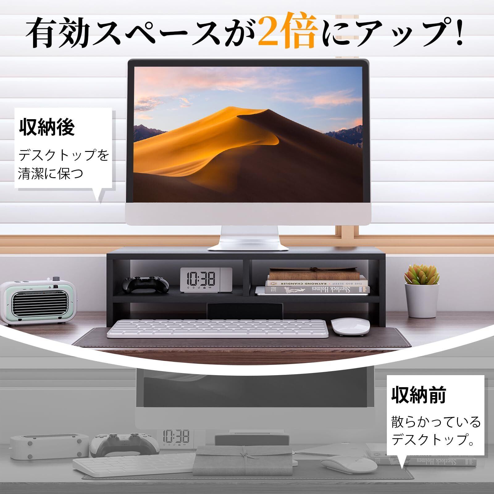 【省スペース&多機能】モニター台は様々な場合に大活躍!本棚やプリンター台/fax台などとしても便利です。キーボードやマウスを収納するには役に立ちます。多機能な机上台で、オフィスや研究室やリビングルームなどの場合もオススメです。画像や鉢植えなどお好きなものを飾れば、自分だけの癒し空間がつくれます。疲れが吹き飛んで作業率もアップさせる。