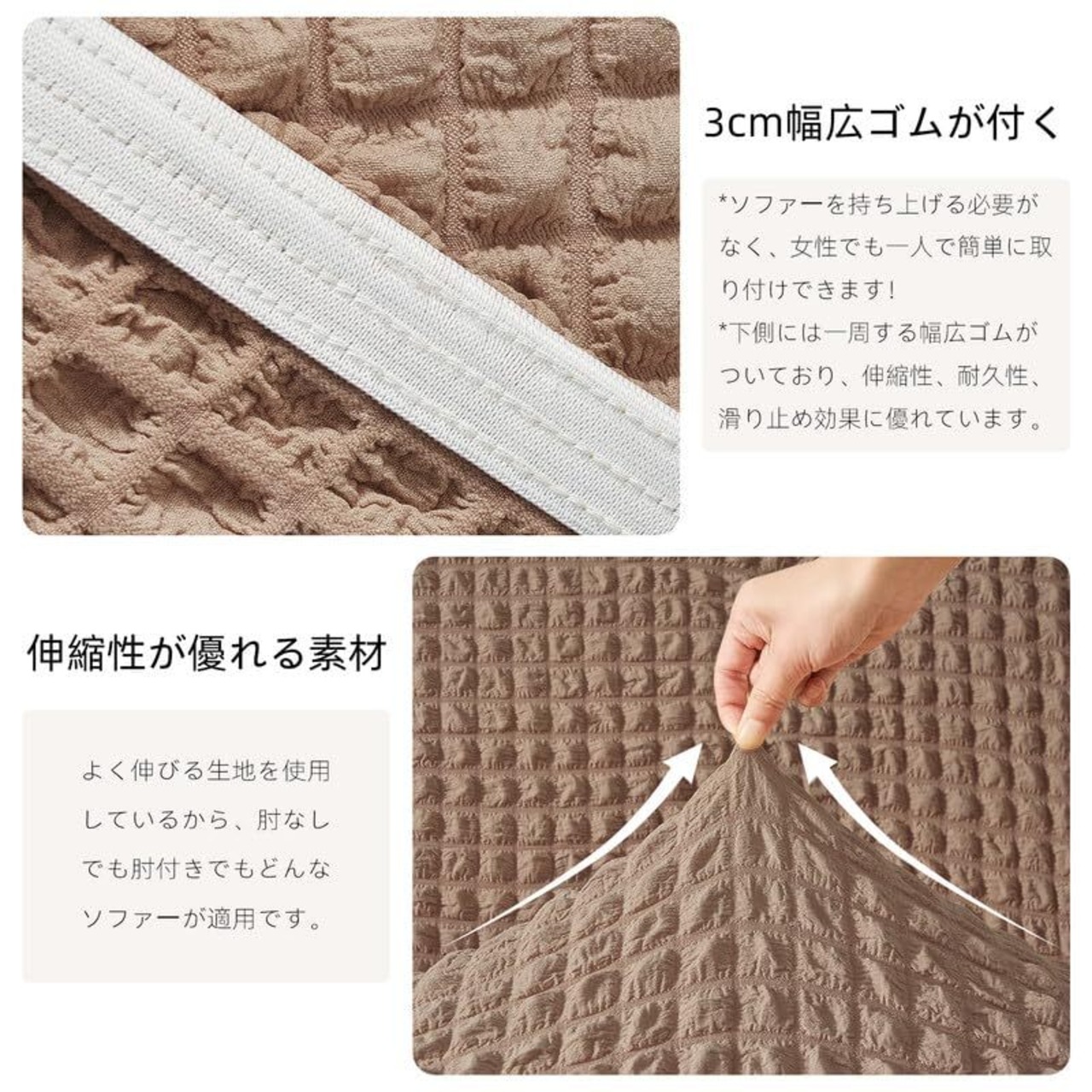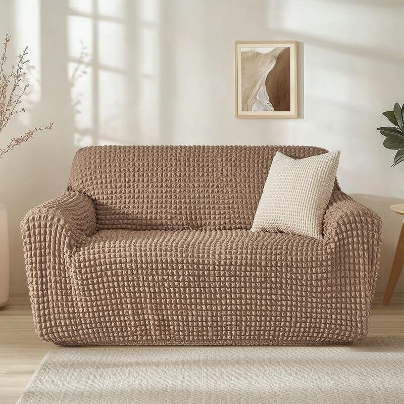 可愛くて高品質なポリエステル素材:ポコポコとした独特なテクスチャーが特徴で、丈夫でありながら柔らかく、肌触りも抜群です。キズや汚れを防ぎ、繰り返し洗っても縮まず、毛玉ができにくく、色あせも少なく、通気性にも優れています。弾力のある素材が様々な形やサイズのソファにしっかりフィットし、かけるだけソファカバー、ズレがない快適にお使いいただけます。長期間使用できる高品質な素材です。