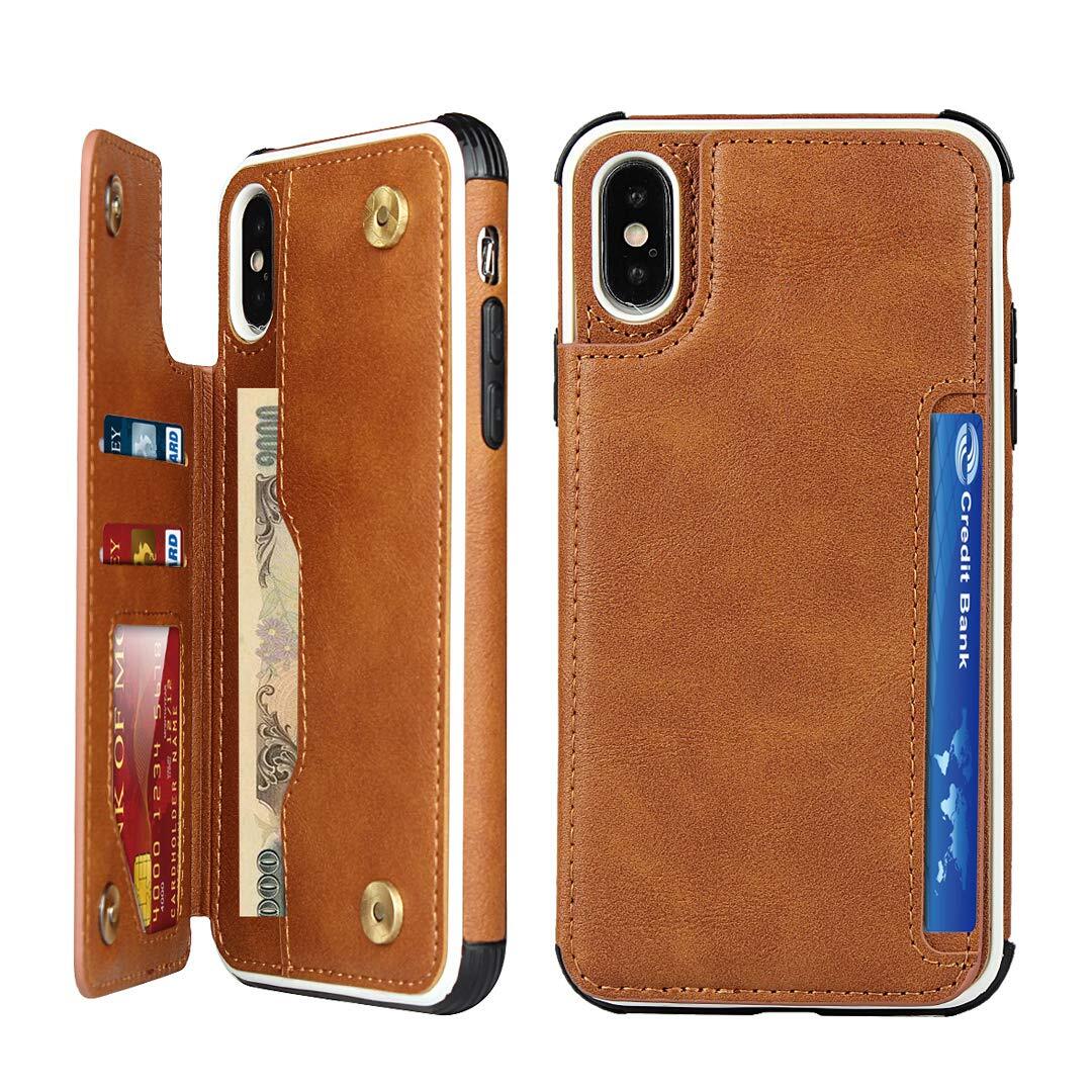 Pelanty for iPhone X ケース iPhone XS ケース縄掛け 5.8インチ 背面 手帳型 PUレザー IC カード収納 軽量 スタンド機能 ボタン磁気 多機能 アイフォンX/XS スマホケース 耐衝撃 滑り防止 全面保護 ストラップ 携帯カバー -ブラウン