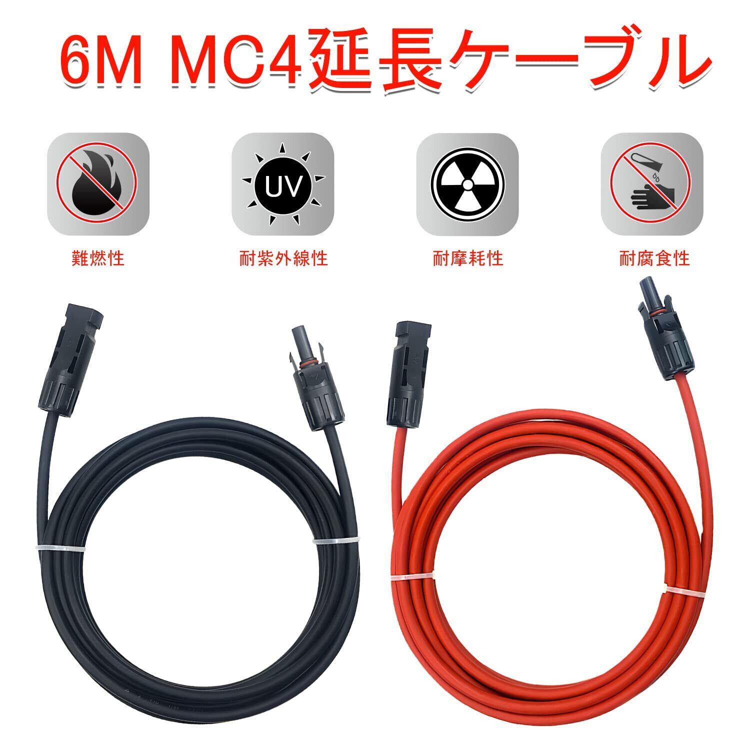 MC4 延長ケーブル ソーラーケーブル ソーラーパネル延長ケーブル 6m 4SQ 1500V ソーラーパネルPV延長ケーブル 太陽光パネル用ケーブル MC4型 コネクター IP67防水 両端加工 MC4コネクタ付き 2本/組 6m赤+6m黒 | yankees