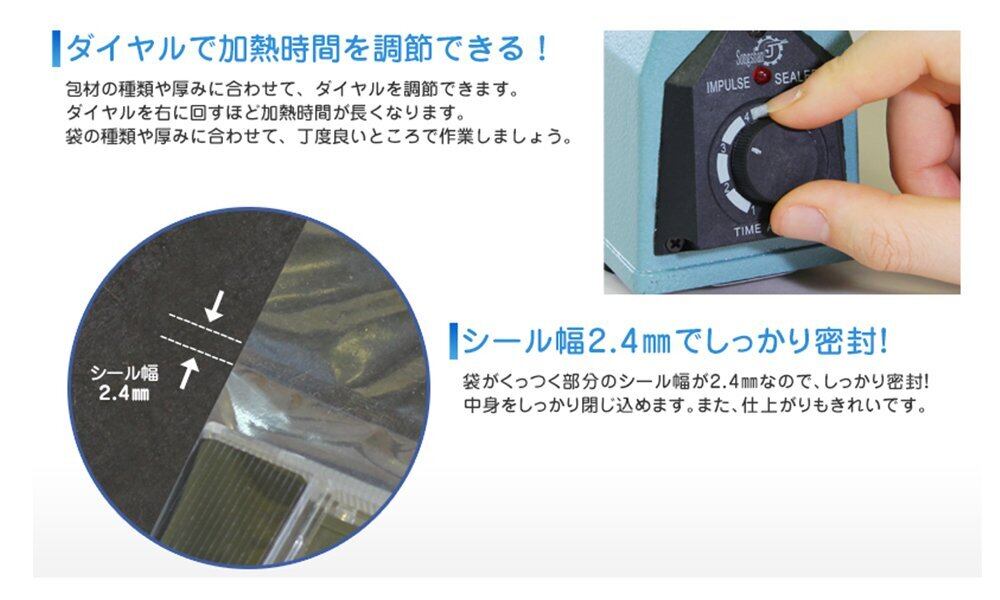 [シール幅]200mm [シール巾]2.4mm [シール可能フィルム厚]0.3mm以下 [溶接時間]最大1.5秒