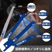 鉄工用替刃:ブレードの材質は高強度のBI-METALを採用して、歯の材質は高強度のHSSです。計7枚 山数:18山×150mm×2本/14山×150mm×3本/10&14山×230mm×1本/14山×230mm×1本。細めの鉄工の切断に向いています。具体的な切断能力については下記商品の説明にご参考をください。