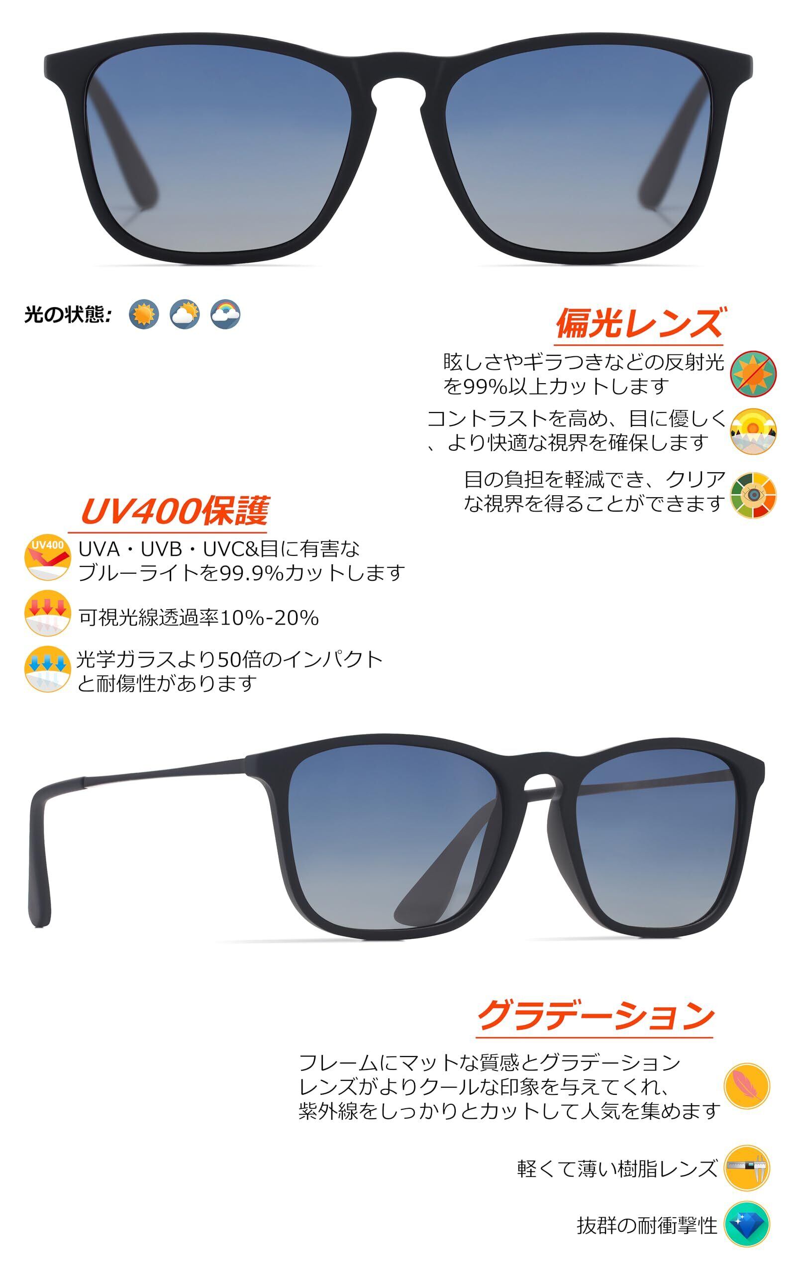 【UV400保護+偏光レンズ】UVA・UVB・UVC&目に有害なブルーライトを100%カットし、可視光線透過率10%-20%。光学ガラスより50倍のインパクトと耐傷性があります。偏光レンズ使用のため、眩しさやギラつきなどの反射光を99%以上カットします。コントラストを高め、目に優しく、より快適な視界を確保でき、目の負担を軽減し、クリアな視界を得ることができます。しかもポリカーボネート偏光レンズでより鮮やかな視界、軽くて薄い、抜群の耐衝撃性が実現できます。