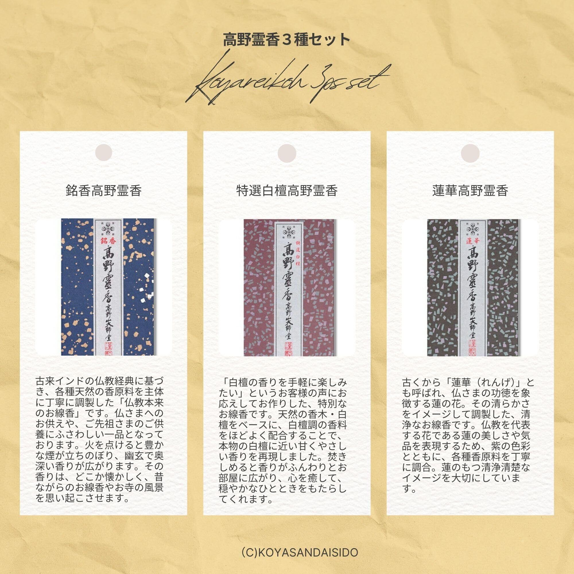 ️セット内容:銘香高野霊香5寸(約75本入)×1箱、特選白檀高野霊香5寸(約75本入)×1箱、蓮華高野霊香5寸(約90本入)×1箱
