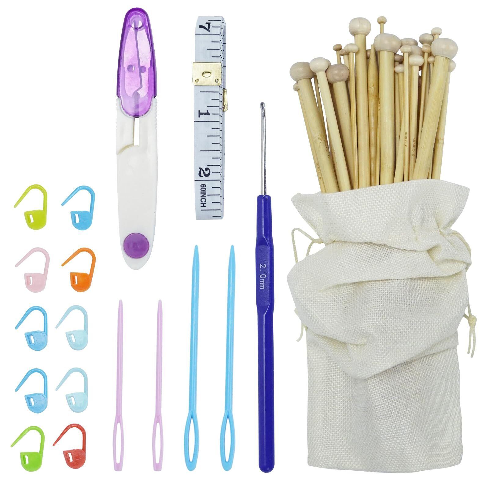 パッケージリスト:棒針x36本、レース針x1本、巻尺x1個、ハサミx1個、段数マーカーx10個、とじ針x4本。