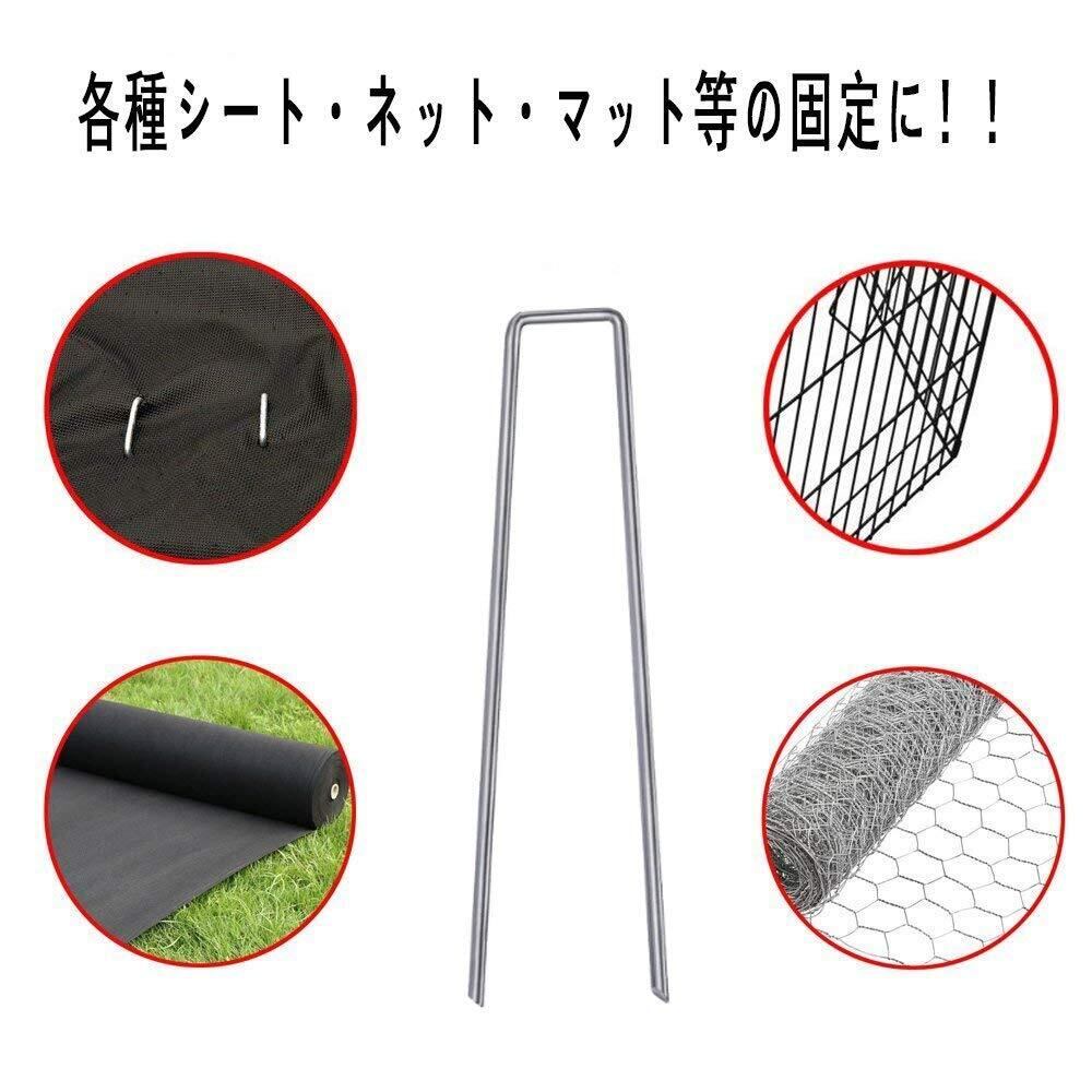 【鋭利な先端で、施工が楽】ピンの先端は角度45度の剣先カット!分厚い高耐久の防草シートにも楽に挿し込みむことが出来ます!作業をもっとスムーズに!。一点固定ではなく、両端が地面に刺さるため、固定力を最大限に発揮させます、強風によるシートの飛んだり、めくれたりしなく、安定感は抜群です。素人でも打ち易いし、打った後もしっかり固定です。
