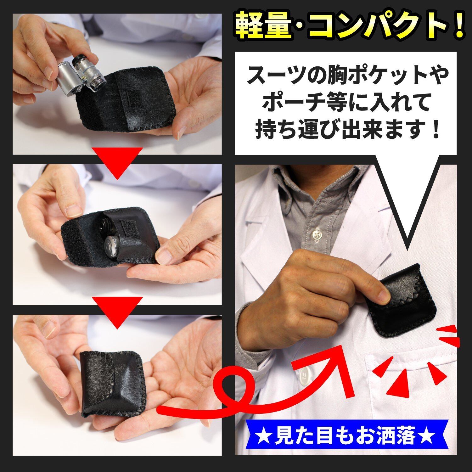 【携帯にも便利】軽量・コンパクト!スーツの胸ポケットやポーチ等に入れて持ち運び出来ます!収納に便利な専用ケース付き。いつでも、どこでもすぐに取り出せて使えます。観察、研究、校正、校閲、鑑定、基盤など、あらゆるシーンで活躍します!LEDライト&ブラックライト搭載なので、暗闇でも使えて細かいところまではっきり見えます。