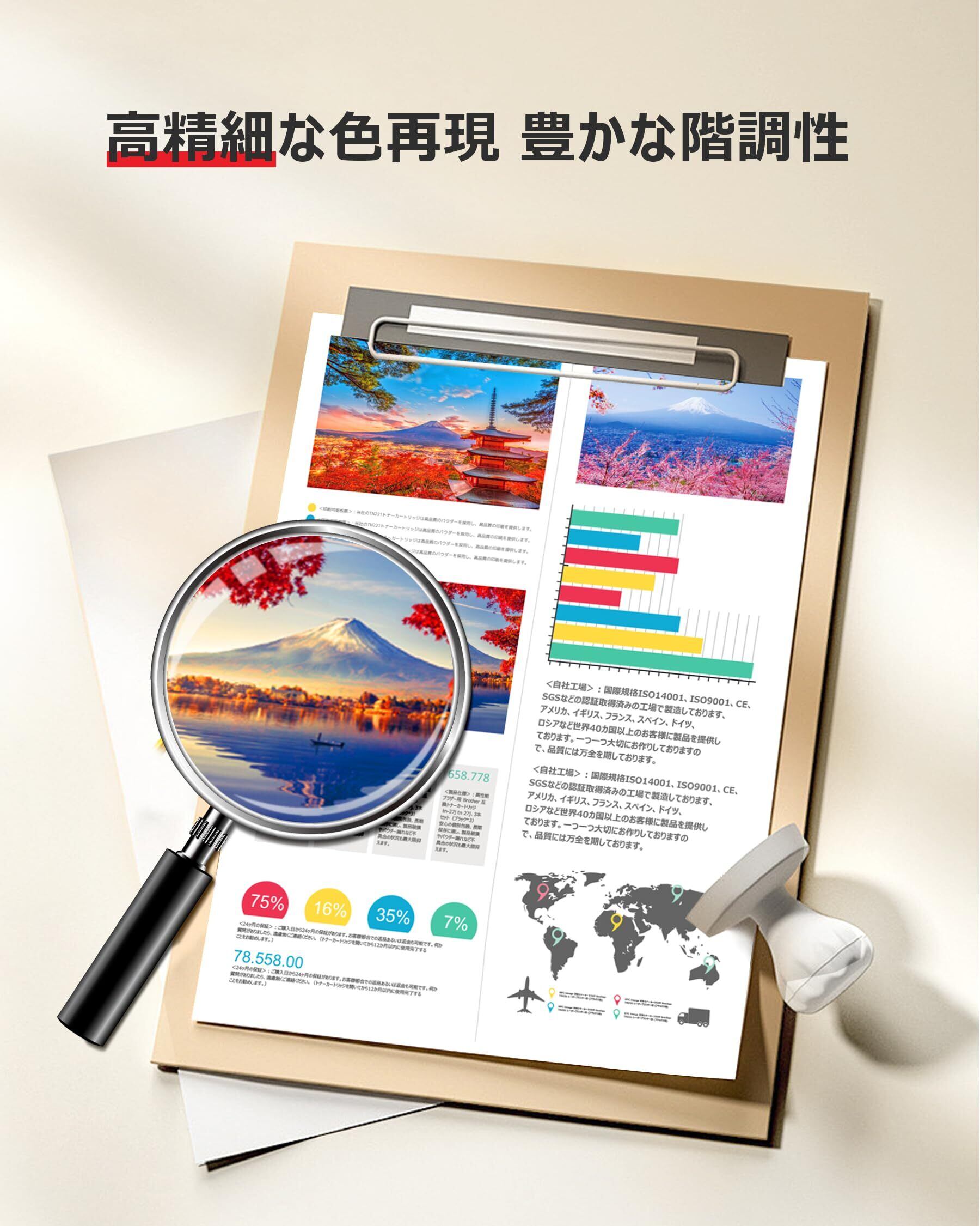 【染料を採用】弊社のキャノン ( Canon )用 インク 381は染料インクを採用しています。染料インクとは、拡散係数が低いため、飽和度が高く鮮明な印刷効果を再現します。また、その表面張力特性により、用紙の表面にインクが吸収されやすいため、印刷品は光沢の維持が可能になります。