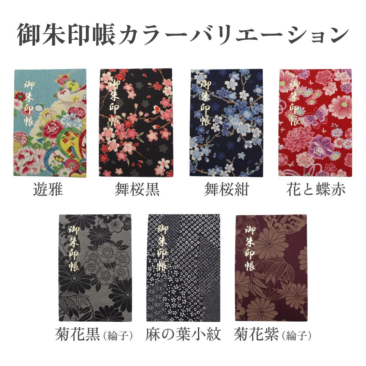 【素材】舞桜紺、舞桜黒、小紋、花と蝶赤、遊雅の5種類は「ちりめん生地」を使用。綸子黒、綸子、紫は「綸子生地」を使用。
