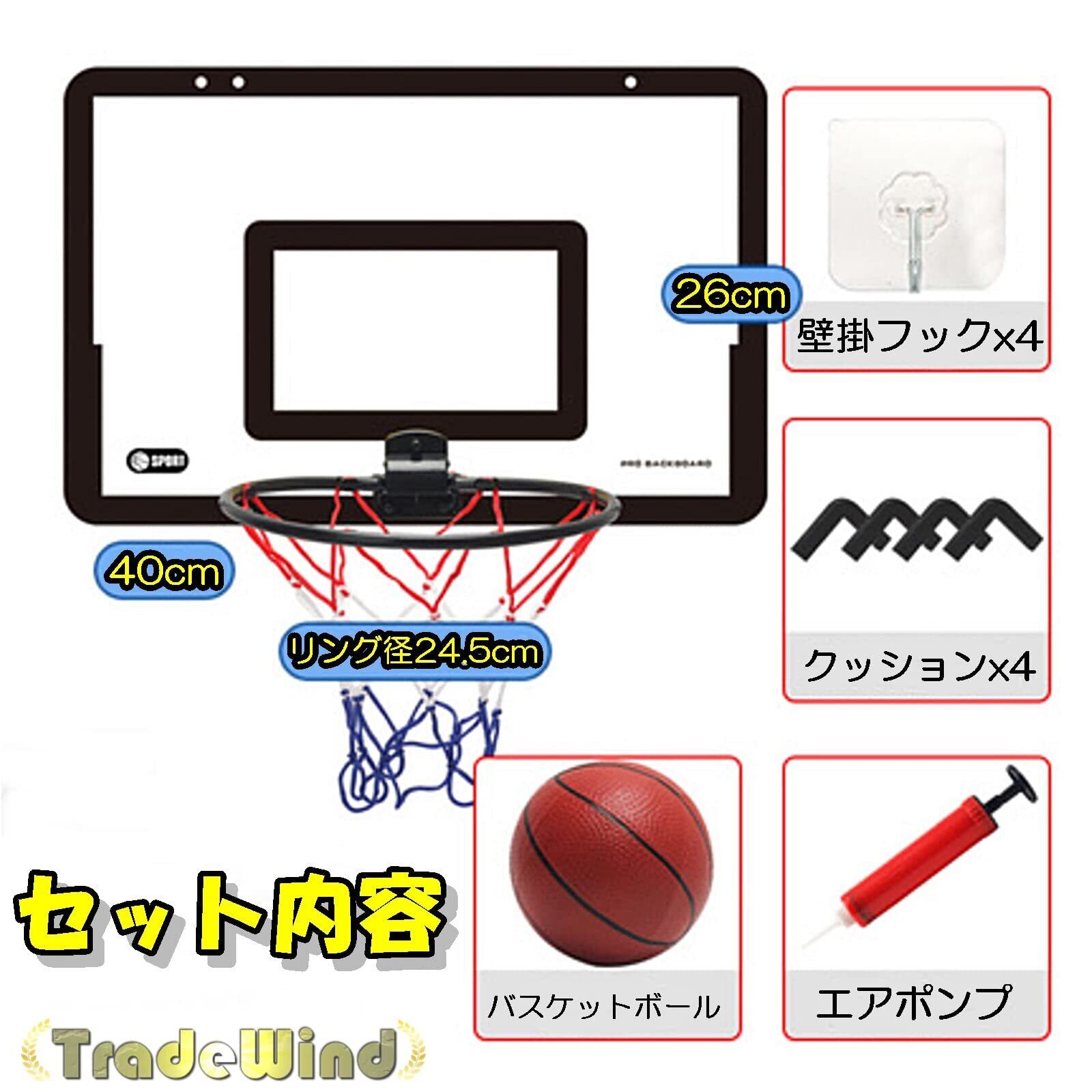 【セット内容】バスケットゴール、ゴールネット、ボール、エアポンプ、シールタイプフック×4、傷騒音防止クッション×4【サイズ】ゴール板:40×26cm ゴールリング:24cm ボール:15-16cm