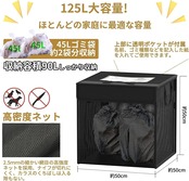 【商品仕様】カラー:ブラック、折りたたみ時の厚み:約2cm、重量:約1.5kg、材質:ポリエステル、ポリ塩化ビニル。【セット内容】ゴミネットx1、防風ワイヤーx1、カラビナx1、底面フレーム板x1、日本語説明書x1※45Lのゴミ袋2個が収納目安になります。