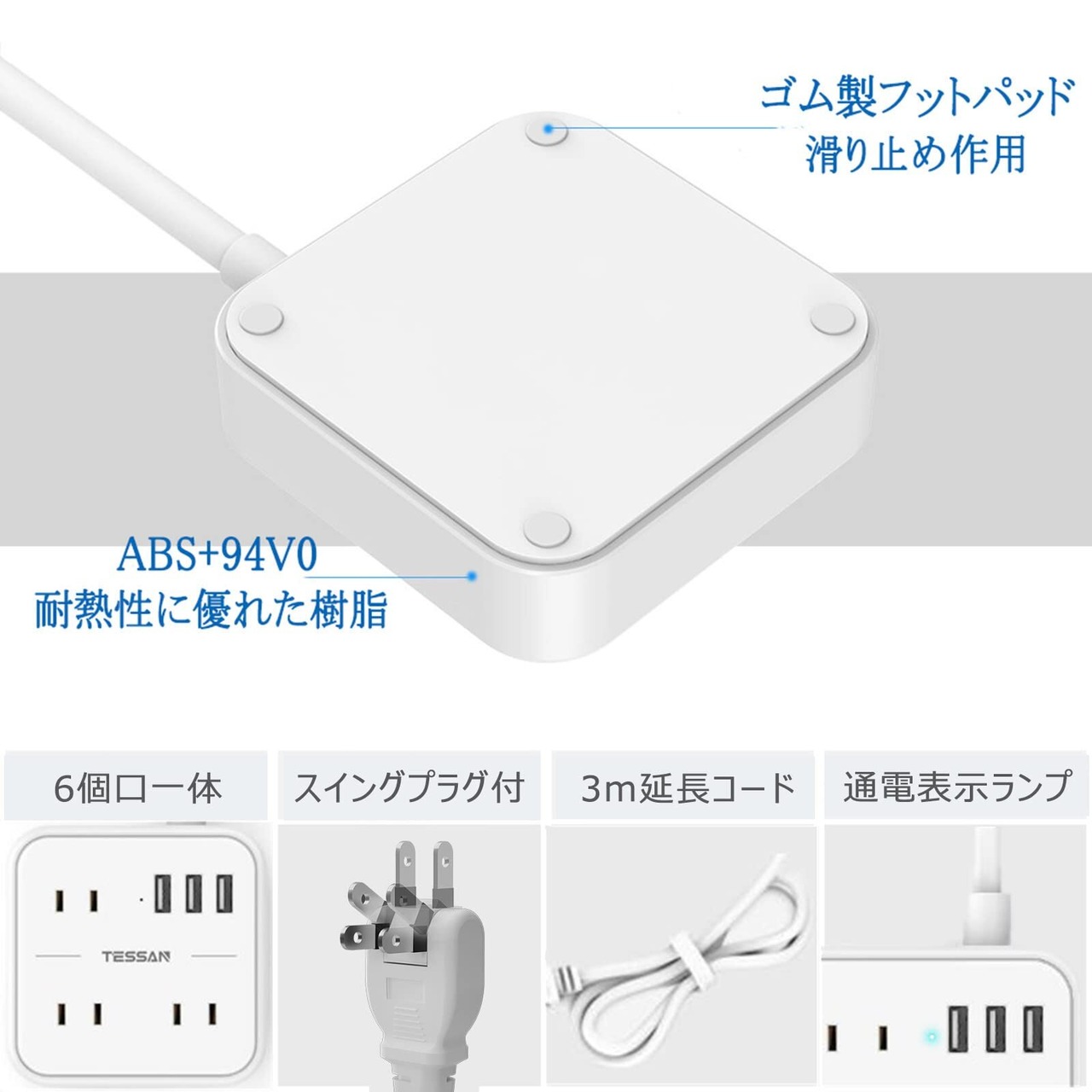 延長コード 3m 電源タップ usb付き コンセント TESSAN 3個AC口 3usbポート 蛸足コンセント タコ足配線 テーブルタップ マルチタップ oaタップ コンパクト ホワイト