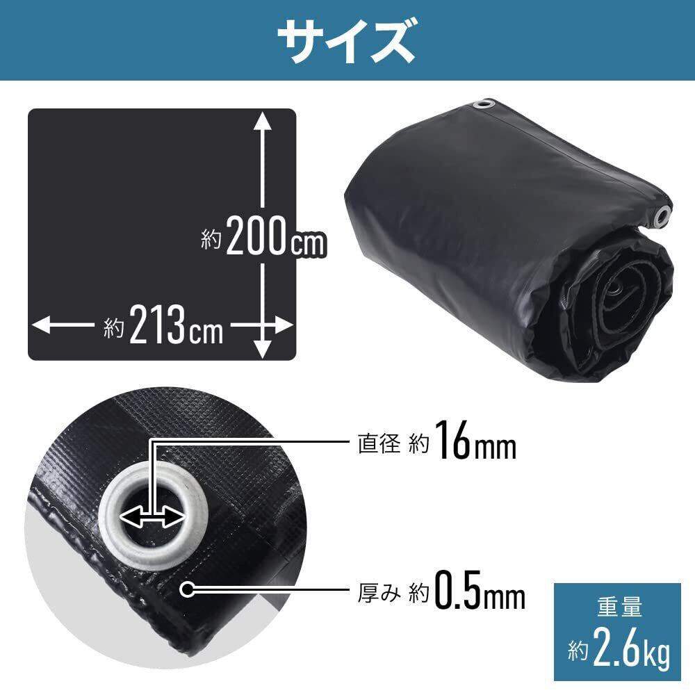 【商品詳細】 サイズ(約):213×200cm、厚み/0.5mm(縁を除く)、ハトメ穴/直径16mm 重量(約)2.6kg ハトメの数:16個 材質:PVC カラー:ブラック