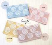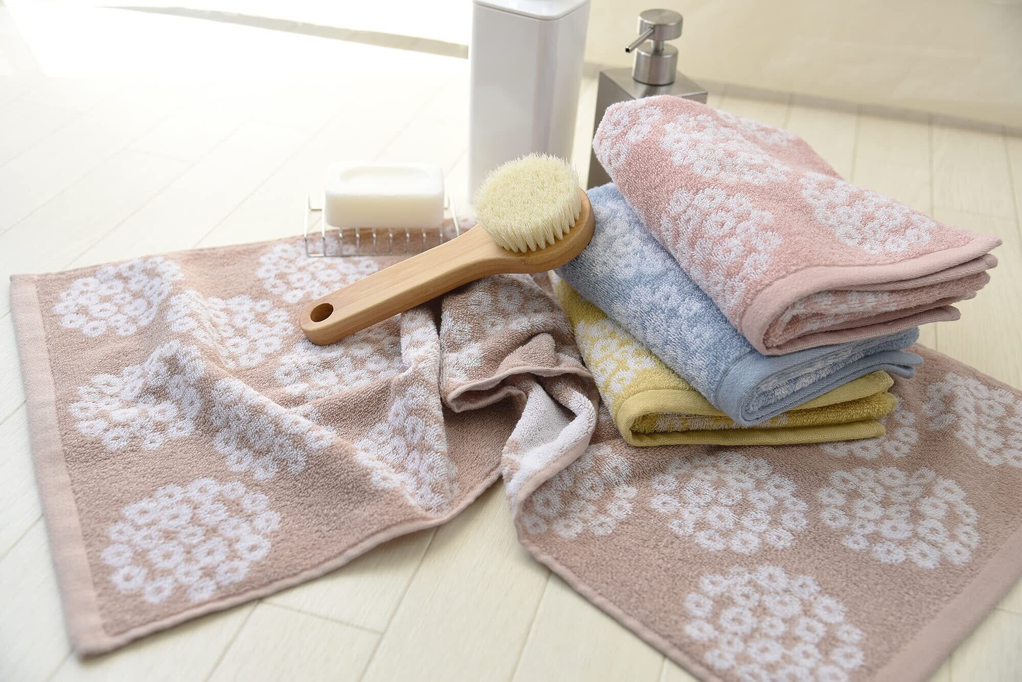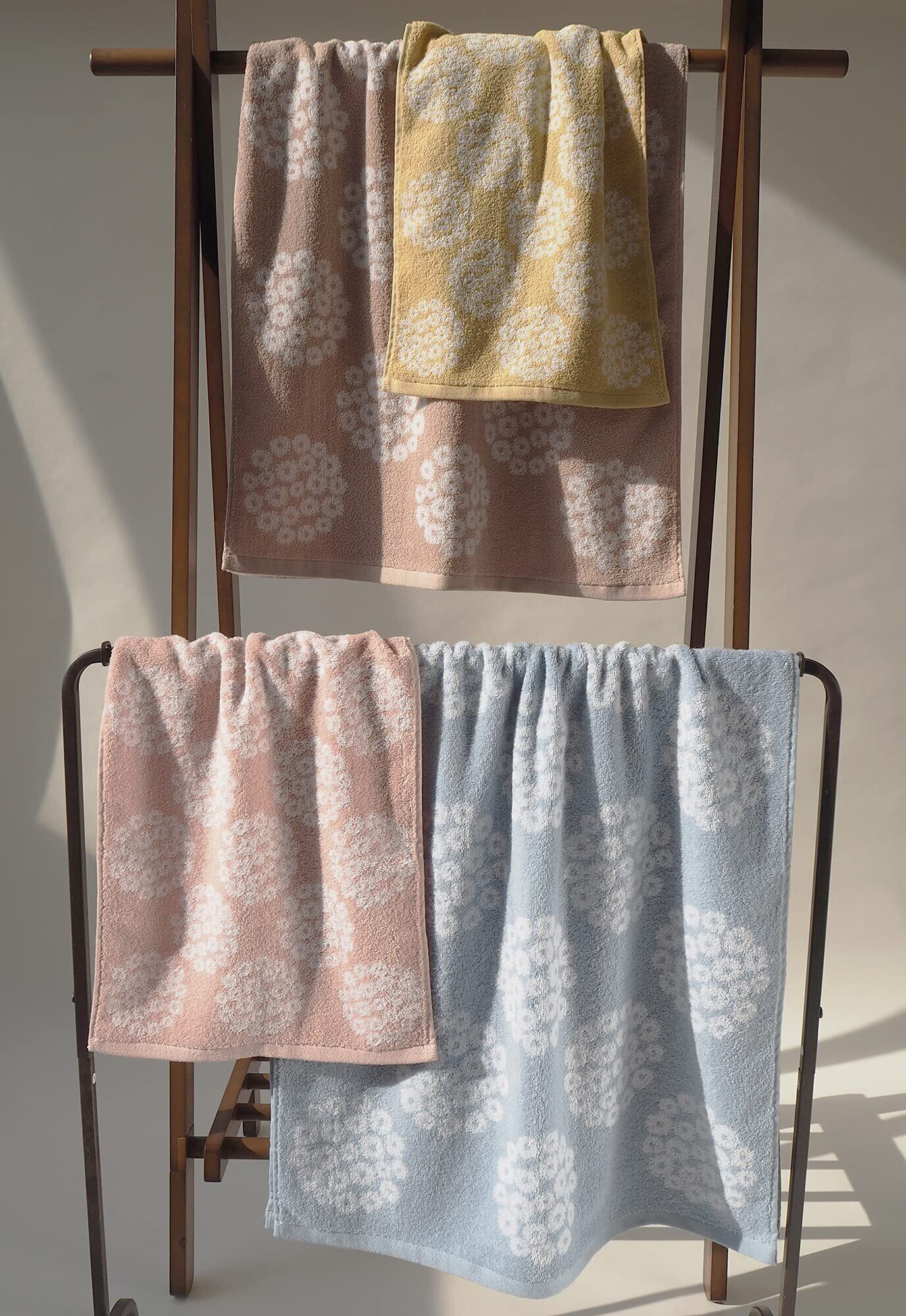 「花束」をモチーフにつくられたデザイン。少しくすんだ色合いが優しいイメージとぴったりです。普通の糸より、撚りが甘いあま撚り糸を使った、ふんわりと肌触りのやさしいタオルです。