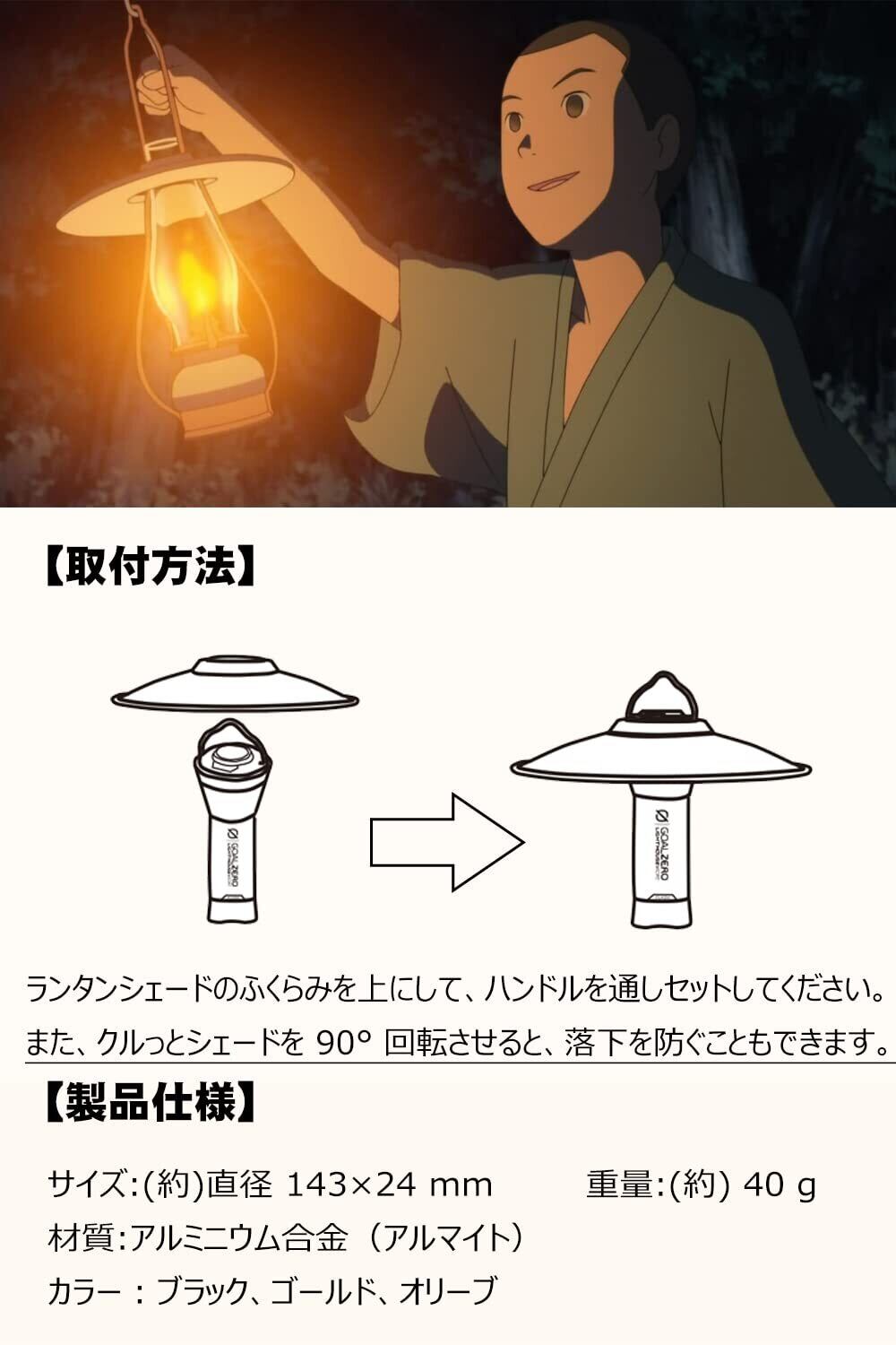 【取り付け簡単】ゴールゼロ シェードのふくらみを上にして、ハンドルを通しセットし、取り付け完了となります。また、ゴールゼロシェードを 90° 回転させると、落下を防ぐこともできます。ランタンシェードの内側の穴は、一致する穴よりもわずかに大きく設計されており、ランタンシェードによるゴールゼロの傷を軽減します