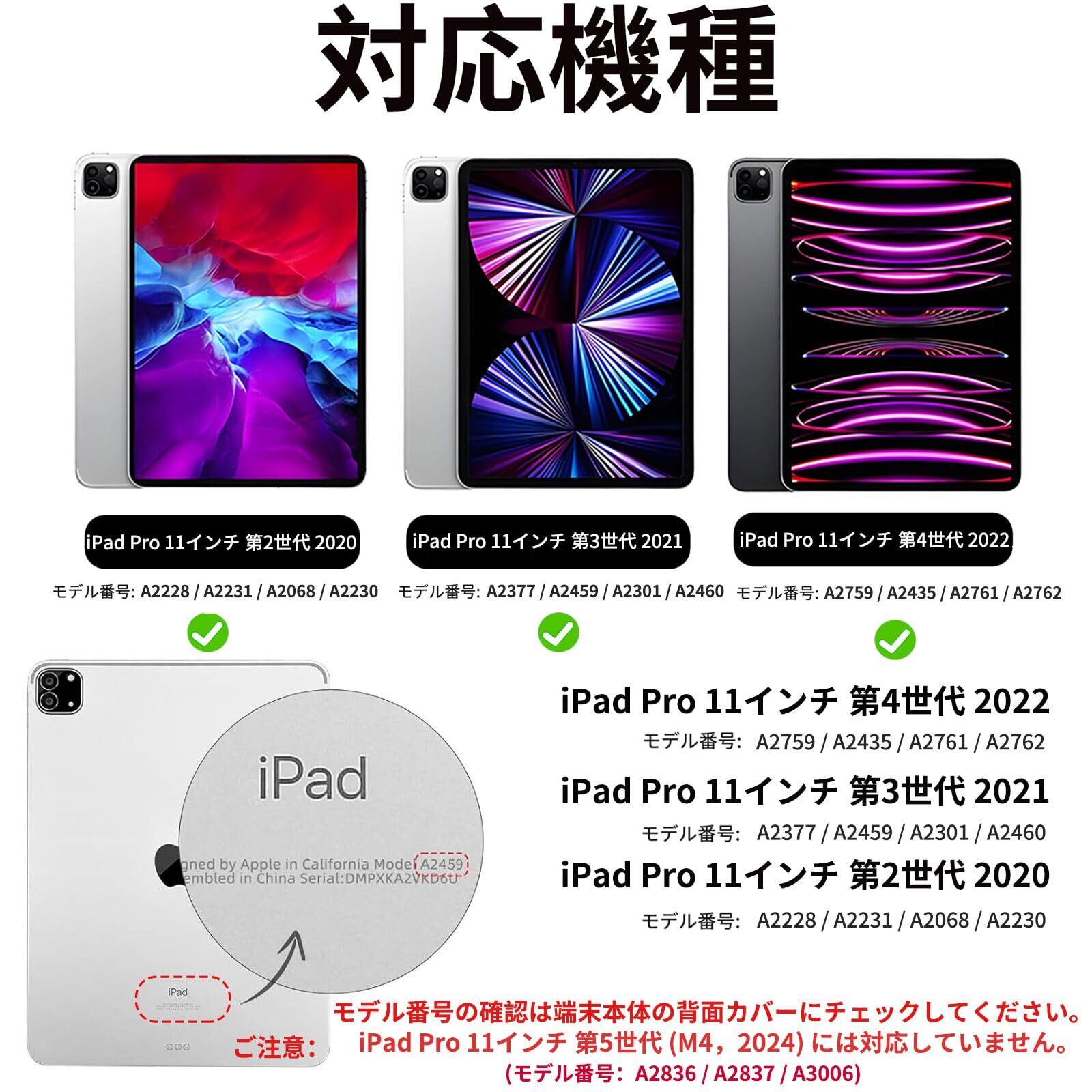 【対応機種】iPad Pro 11インチ (第4世代) 2022発売(対応モデル番号:A2435/A2759/A2761/A2762)、iPad Pro 11インチ 2021 第3世代 (対応モデル番号 A2377 A2459 A2301 A2460)、iPad Pro 11インチ 2020 第2世代 (対応モデル番号 A2228 A2231 A2068 A2230)、他のiPadモデルと互換性がありません。(ご注文した時に、ぜひともお手元のiPadのモデルをご確認ください)