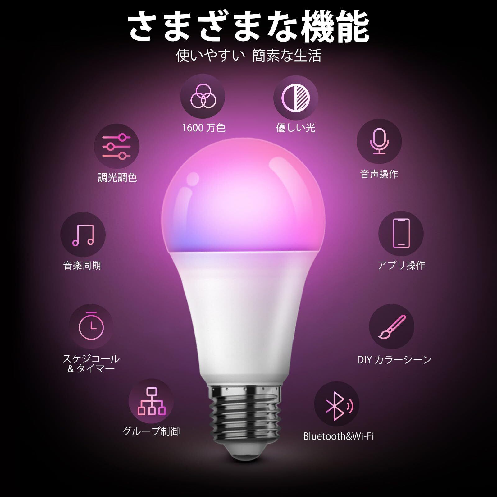 [調光・調色機能]スマート電球の明るさは1%から100%まで調整できます。通常の電球色、昼白色、昼光色などの色温度を設定できるほか、1600万色もあり自分好みにカスタマイズできます。クリスマス、パーティー、誕生日などに適した固定ライトシーンもあります。