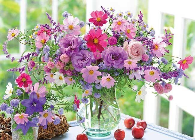 響き合う陽だまりと紫やピンクの花々のアレンジメントが素敵。 ~花言葉~ コスモス・・・調和、乙女の純真。 トルコキキョウ・・・優雅、優美、希望。 センニチコウ・・・永遠の愛、色あせぬ愛。 Photo : Takako Chiba/ AFLO