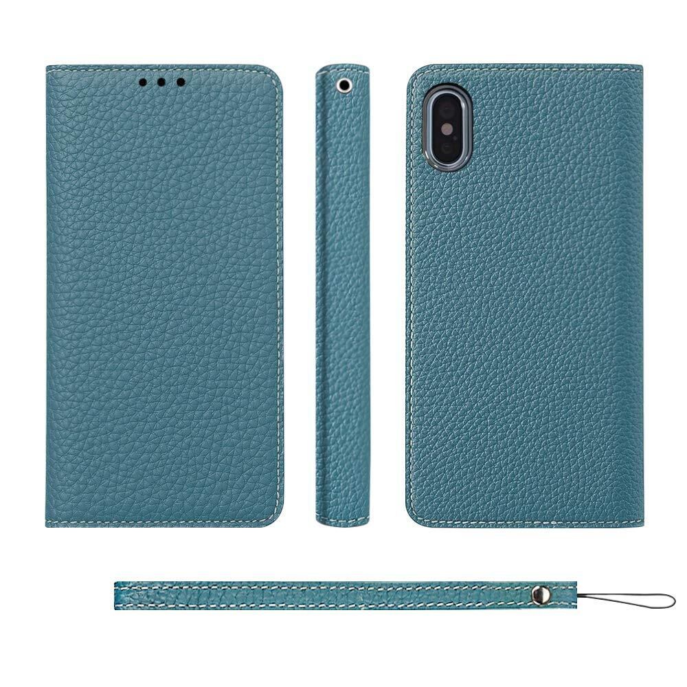 CLICSUN iPhoneX/Xs 対応ケース 高級牛本革ケース 手帳型 アイフォンX/Xs 対応カバー 本革 レザー カバー スタンド機能 ストラップ付き マグネット式 カードポケット ギフトボックス付き ブルー×グレー