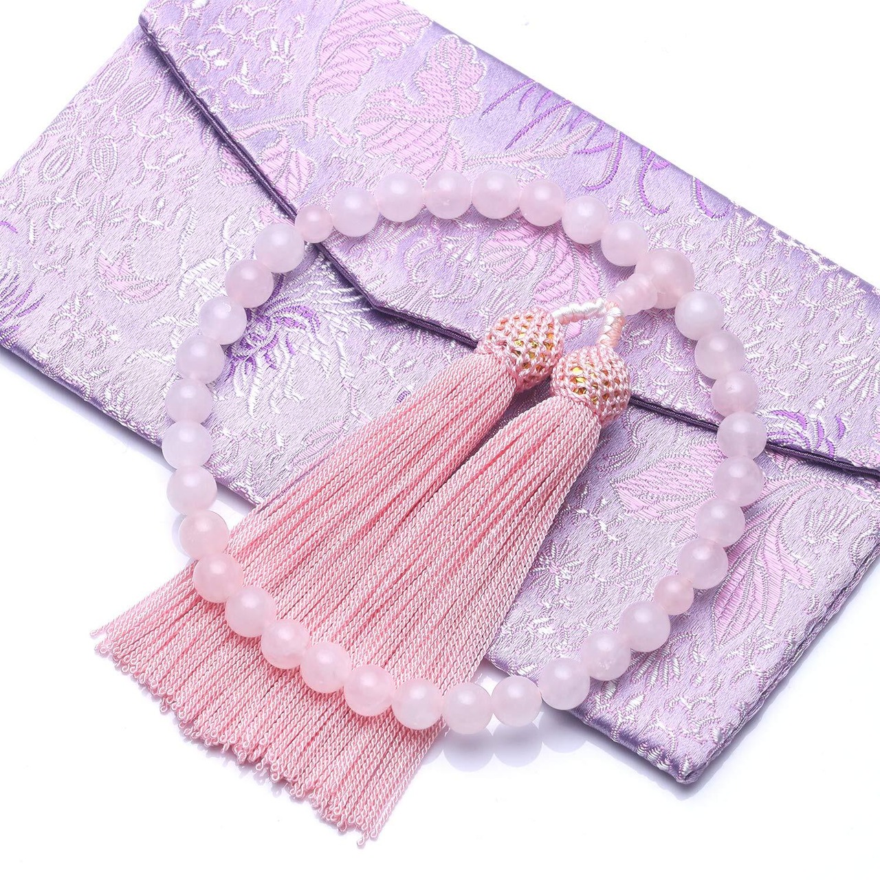 【落ち着いたピンク】色はピンクですが、落ち着いたピンクです。渋い数珠を嫌がる10代20代などの若い方に特におススメしますが、愛らしくエレガントな数珠をお望みの年配の方にももちろん最適です。