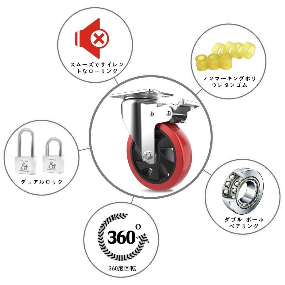 COOWOO 5インチ キャスター 4個セット 車輪 ブレーキ付き 高耐久性 単個耐荷重200kg 360度回転 静音 ミュートシリーズDIY家具交換キット ホイール径125mm 赤 | yankees