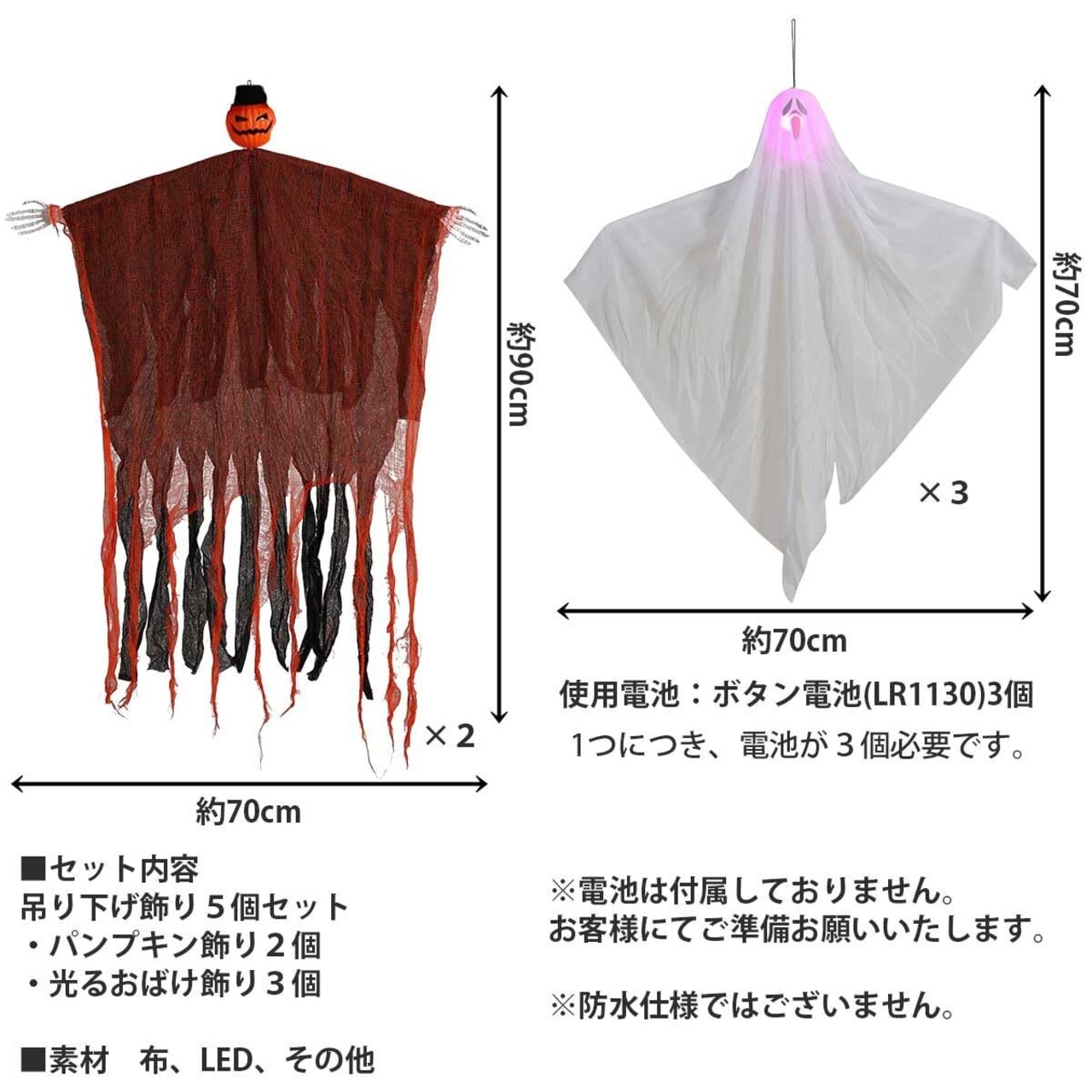 【 お得な本格5点セット 】ハロウィンにピッタリなディスプレイです。天井から吊して飾るだけで本格的なハロウィンデコレーションが完成します