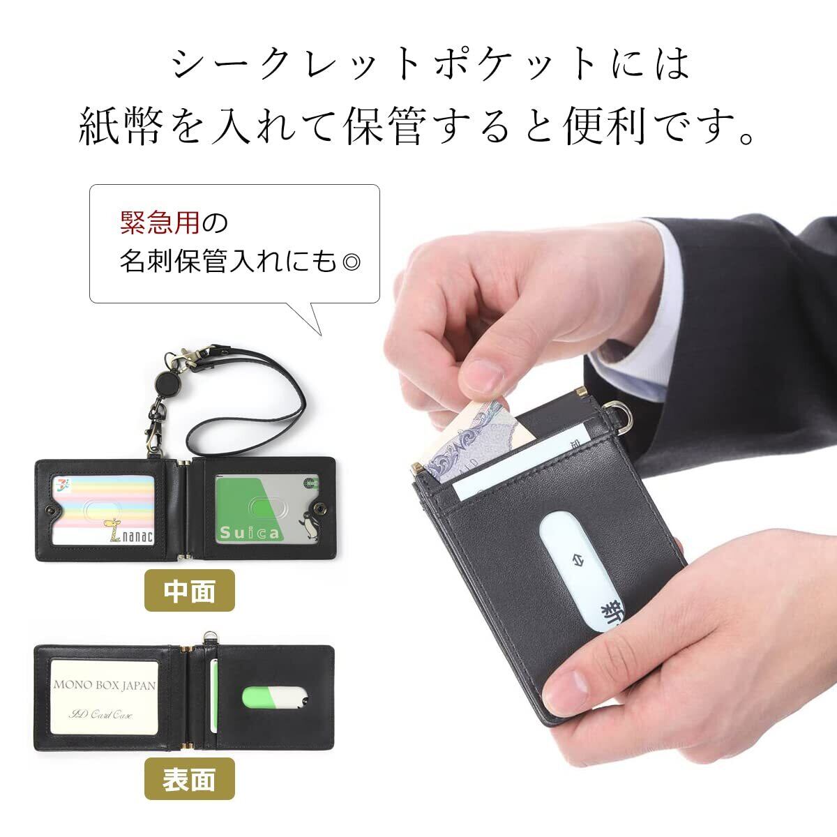 [モノボックス] パスケース 伸縮ストラップ付 定期入れ ICカード2枚使用可能バタフライタイプ 5ポケット 首下げOK pc-mono10 (ブラック)