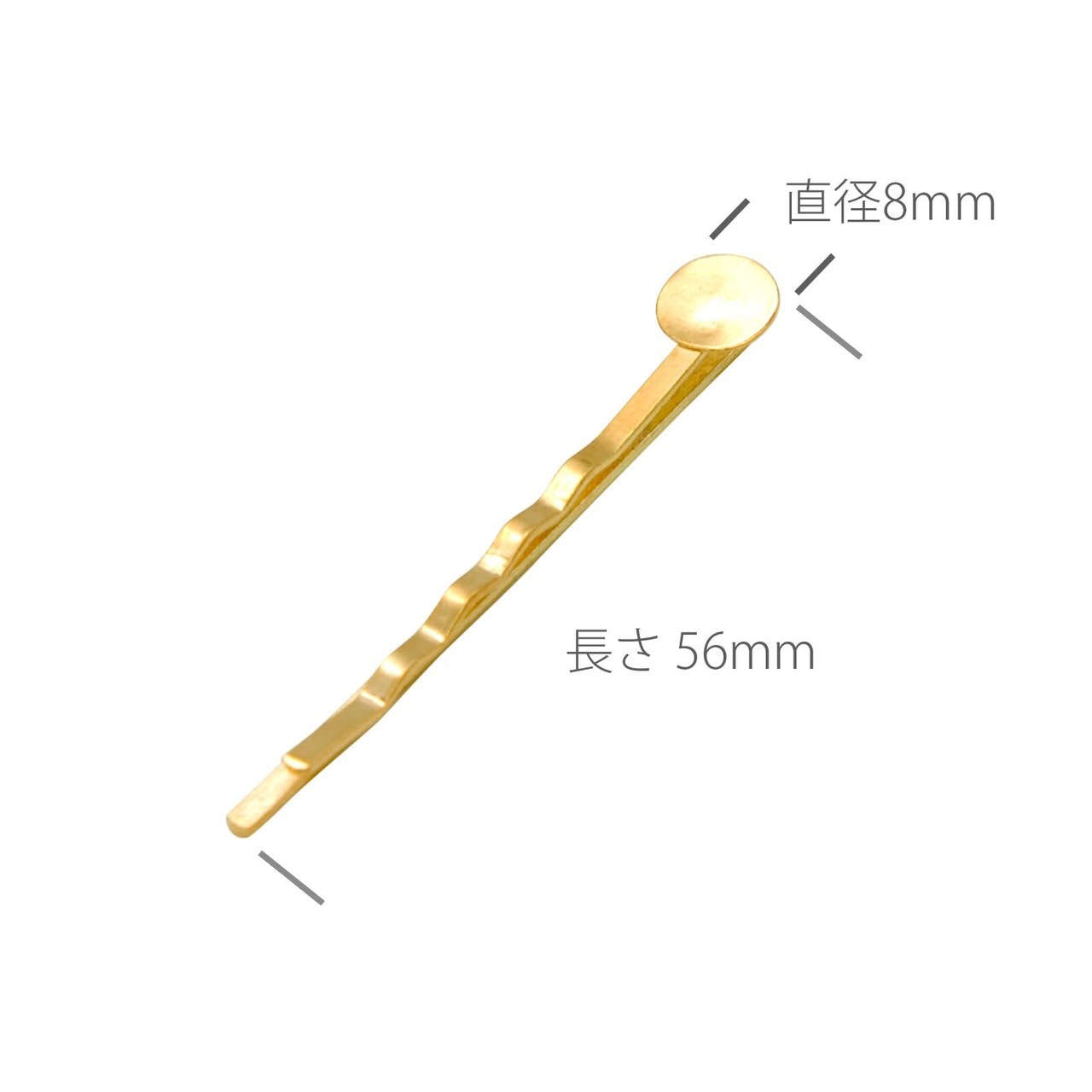 直径8mmの円形台座つきヘアピン 30個セットです。長さ(約)58mm / 台座直径(約)8mm / 重さ(約)1g / 素材:合金。色:ゴールド。台座つきなのでお気に入りのパーツを載せてオリジナルのヘアピンが作れます。いろいろ試して作れる30個セットです。