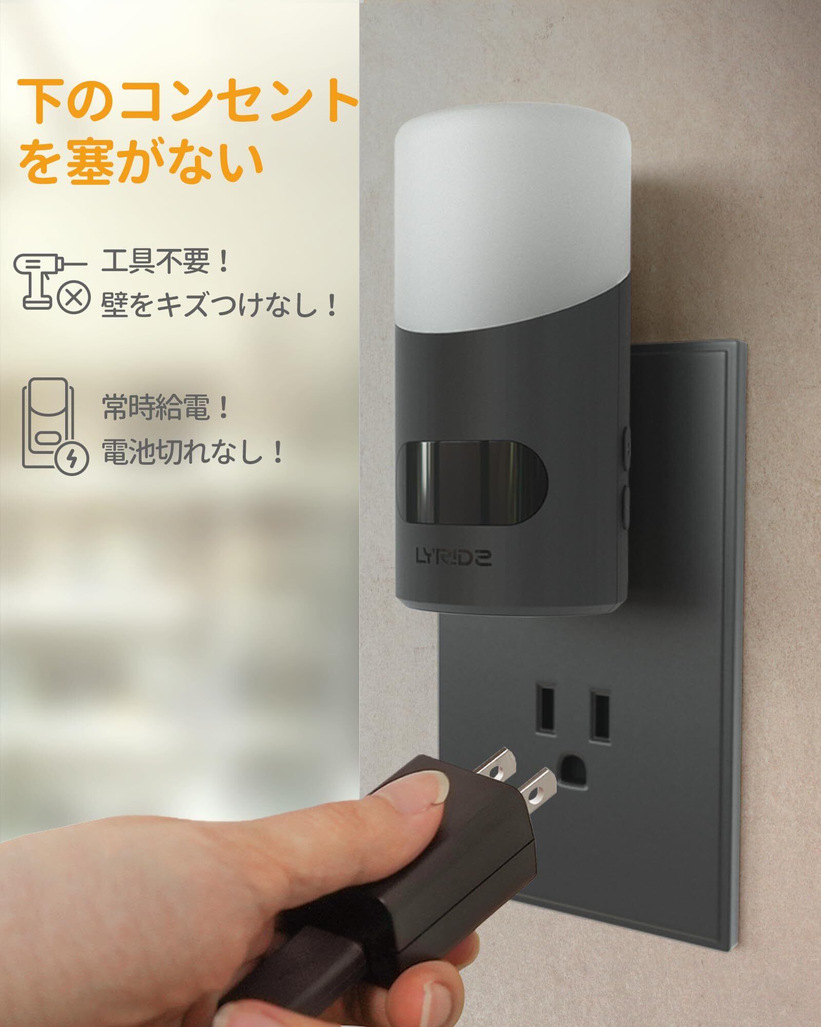 【便利なコンセント式・省エネ】工具不要、コンセントに差し込むだけでセッティング完了!コンセントにより常時給電なので、電池・充電タイプのように電池切れや充電切れを心配する必要がないので、手間なく使用できます。コンパクトなサイズで、上下二口コンセントで使用する場合、下のコンセントを邪魔しないです。光源にはLEDを採用するによって、消耗電力が約2Wで経済的です。1年約5.3円とお得です。(※Auto-120sモードにて、1日8回センサー点灯で、1KWh27円として計算)。