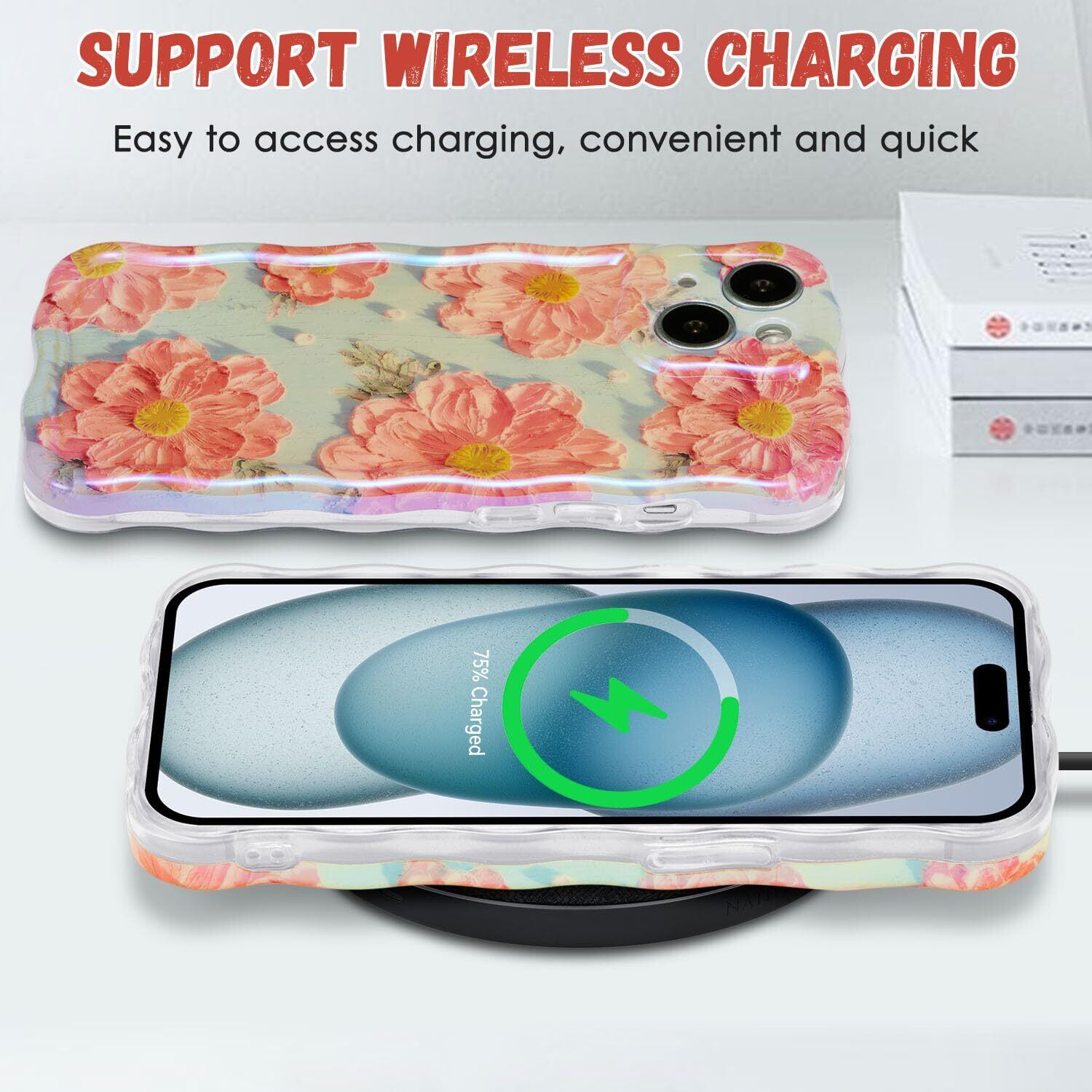 QLTYPRI iPhone 14 用 ケース ウェーブ TPU カバー おしゃれ 韓国 可愛い 花柄 iPhone14用 ケース 薄型 軽量 耐衝撃 スマホケース ワイヤレス充電対応 ストラップホール付き アイフォン14 ケース 6.1インチ 対応 - グリーン/ピンク | yankees