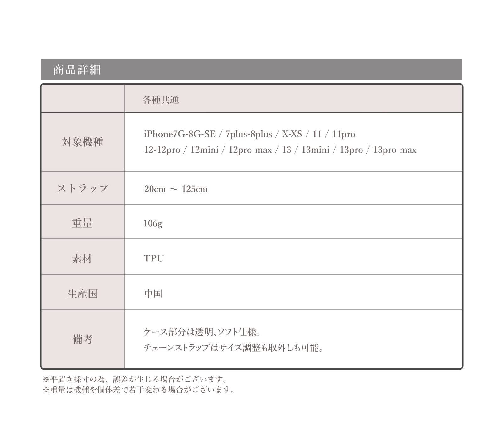 【特徴】チェーンストラップ/ケース部分透明・ソフト仕様/ストラップサイズ調整可・取外し可 ※製品の仕様上鋭利な部分がございます、パーツの取り外し等の際は手を挟まないよう十分ご注意ください。