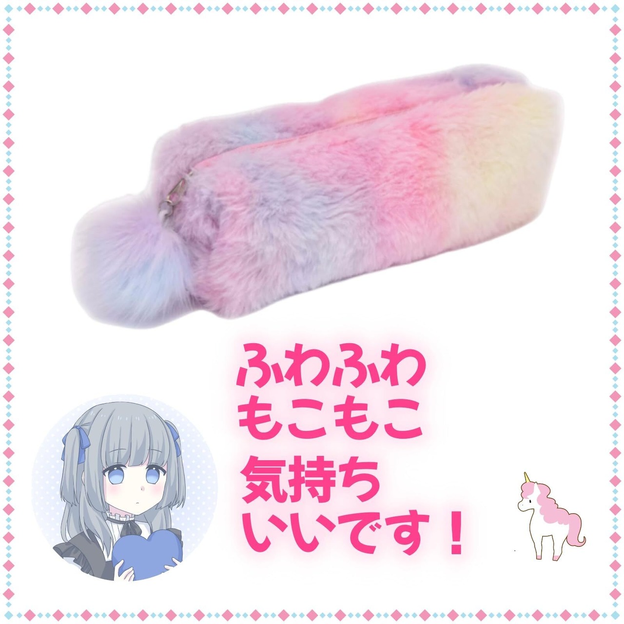 ゆめかわいい、ユニコーンカラーのフェイクファーを使用した、ふわふわもこもこペンケースです。