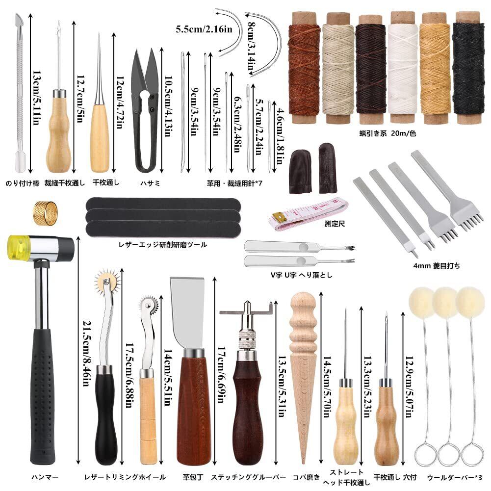 便利な裁縫セット: レザークラフトセットでは、ステッチンググルーバー、ステッチルレット、4本の菱目打ちがセットになっています。菱目穴は縫い目を美しく、均等にします。仕上がりもぐんとよくなります。また、各種のレザー針と高品質のワックス糸を厳選して揃えており、裁縫の出来栄えが多彩になります。