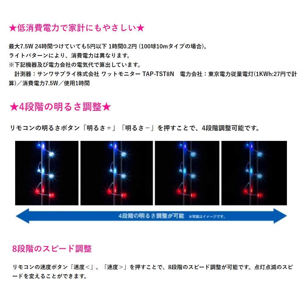 【低消費電力で家計にもやさしい】省エネ仕様で消費電力はわずか7.5W。1日5時間の使用でも1ヶ月の電気料金は約35円と、コストパフォーマンスに優れたライトです。ライトパターンにより、消費電力は異なります。4段階の明るさ調整。リモコンの明るさボタンを押すことで、4段階調整可能です。8段階のスピード調整。リモコンの速度ボタンを押すことで、8段階のスピード調整が可能です。12色の単色点灯もできる。単色での全灯も可能なので、お部屋に合わせたデコレーションが可能です。※単色は全灯(常灯)のみです。パターン変化はできません。